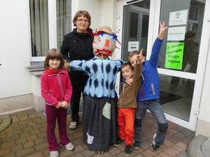 und die Kita Büster Parkstrolchemit der ersten Vogelscheuche mit Rock Erzieherin Ramona Ebert mit drei fröhlichen Kindern.