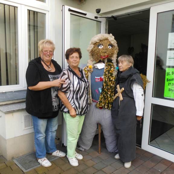 Nun ist im Verwaltungsamt die erste Vogelscheuche für den diesjährigen Wettbewerb abgegeben worden Frida vom Heimatverein Goldene Laus und dem Gartenteam.