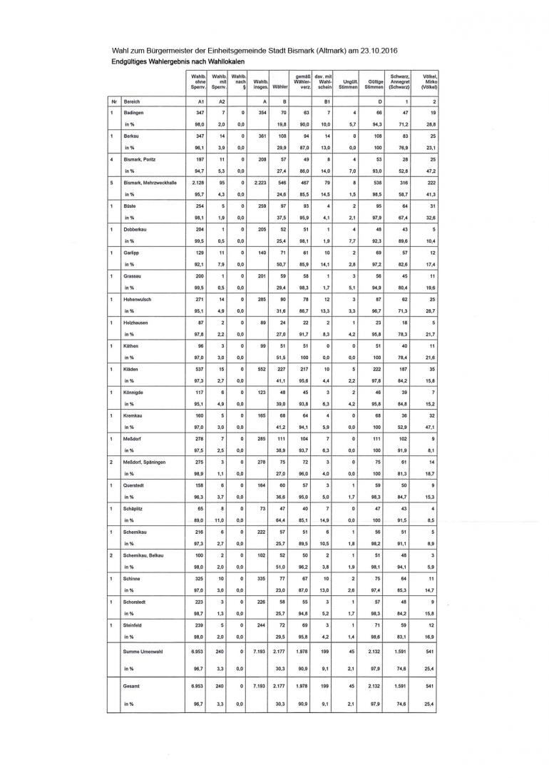 Endgültiges Ergebnis der Wahl zum Bürgermeister der Einheitsgemeinde Stadt Bismark (Altmark) Die Übersicht des endgültigen Ergebnisses der Wahl zum Bürgermeister der Einheitsgemeinde Stadt Bismark (Altmark) nach Wahllokalen -->