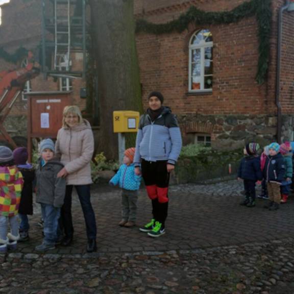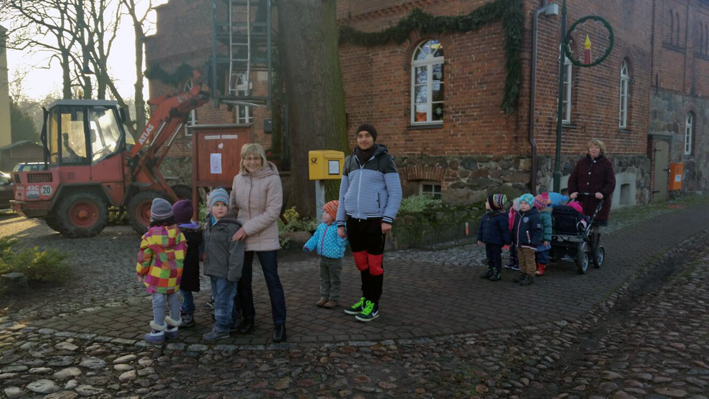 Viel Leben und Treiben herrscht in diesen Tagen rund um den Klädener Schlossplatz beim Aufbau und der Dekoration für den Klädener Adventsmarkt. Davon überzeugten sich die Kinder der Kita Pittiplatsch auf ihrem täglichen Rundgang, auch mit Station beim neuen Weihnachtspostamt.