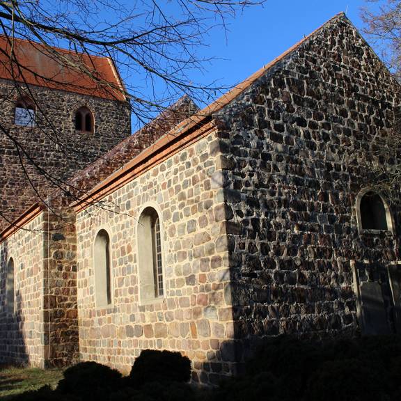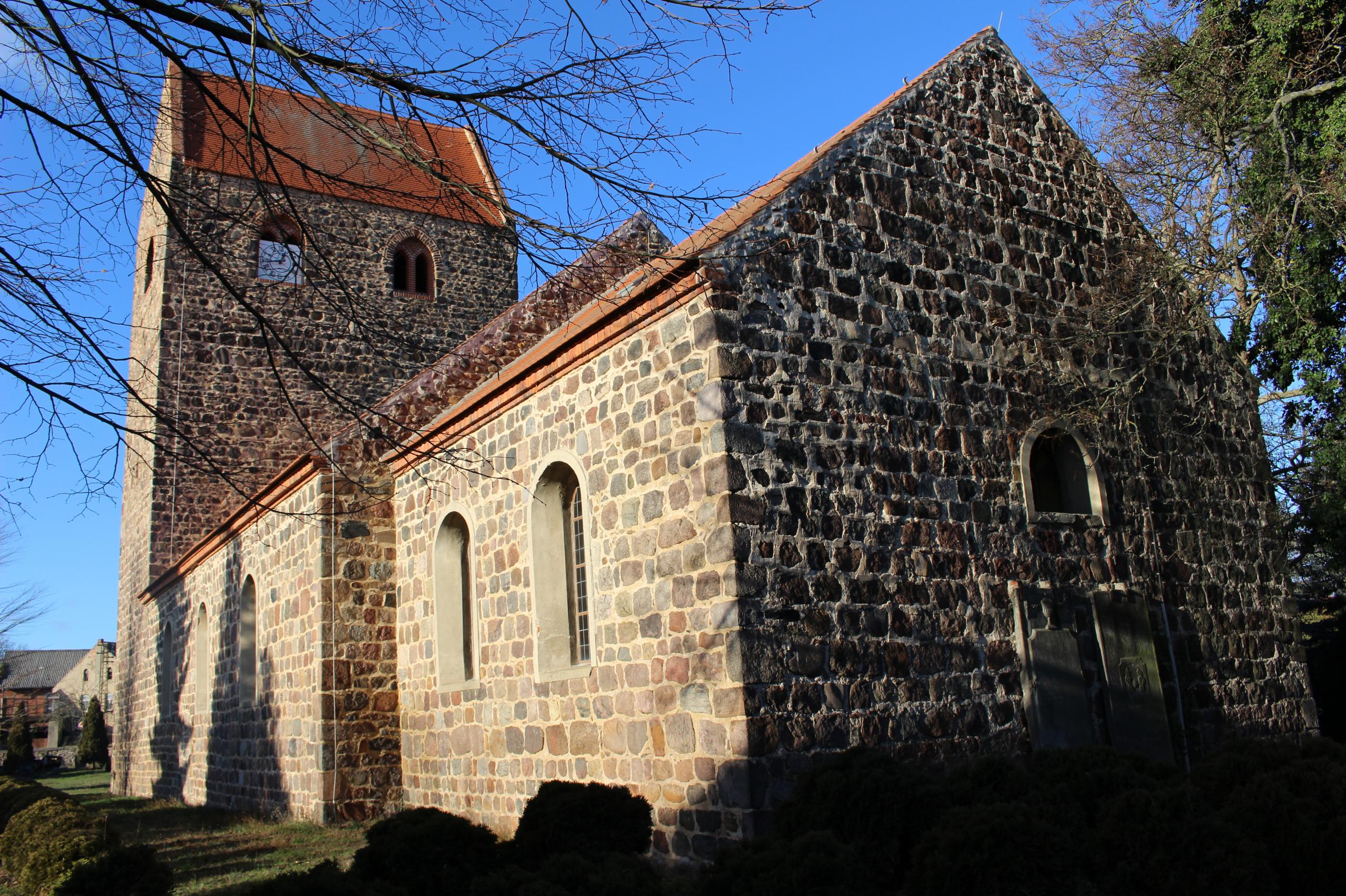 Die Dorf- und Patronatskirche in Badingen besticht auf den ersten Blick durch das mächtige, dem Dorf zugewandten Westwerk.