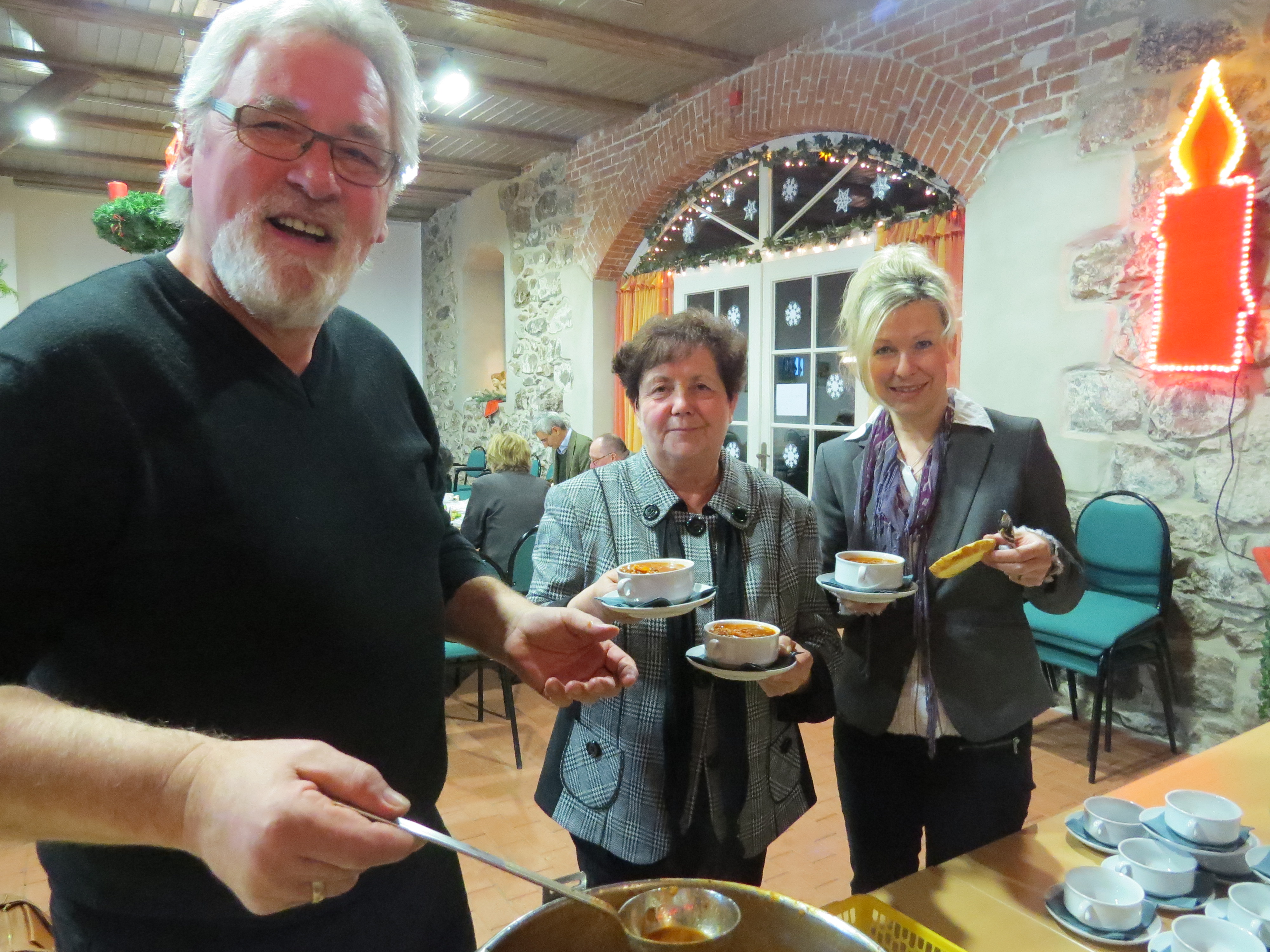 mit Kelles Soljanka im Alten Schafstall anlässlich der letzten Ortsbürgermeisterberatung des Jahres 2016, bei der Einheitsgemeinde-Bürgermeisterin Verena Schlüsselburg nach getaner Arbeit alle Orts-Bürgermeister zu einem Süppchen aus den neuen Suppentassen einlud. Meßdorfs Ortsbürgermeister Uwe Lenz schwang die Suppenkelle und Verena Schlüsselburg und Sachgebietsleiterin Judith Budach machten Handreichungen.