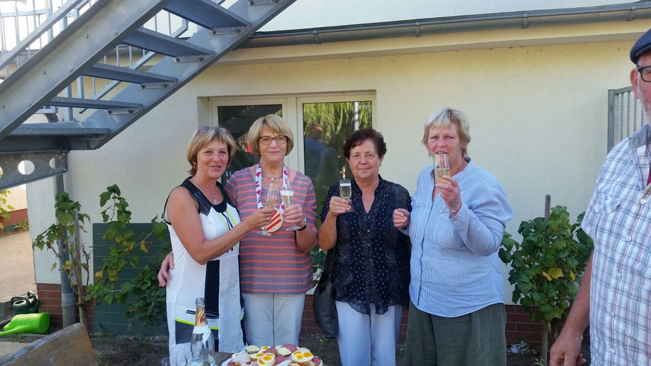 stoßen mit einem Gläschen Sekt auf schöne vergangene Zeiten und auf den bevorstehenden Ruhestand an.