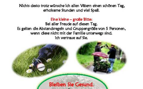 Der Vatertag ist in diesem Jahr wie so vieles anders als sonst. Nichts desto trotz wünsche ich allen Vätern einen schönen Tag, erholsame Stunden und viel Spaß. Eine kleine – große Bitte: Bei aller Freude auf diesen ... weiter...