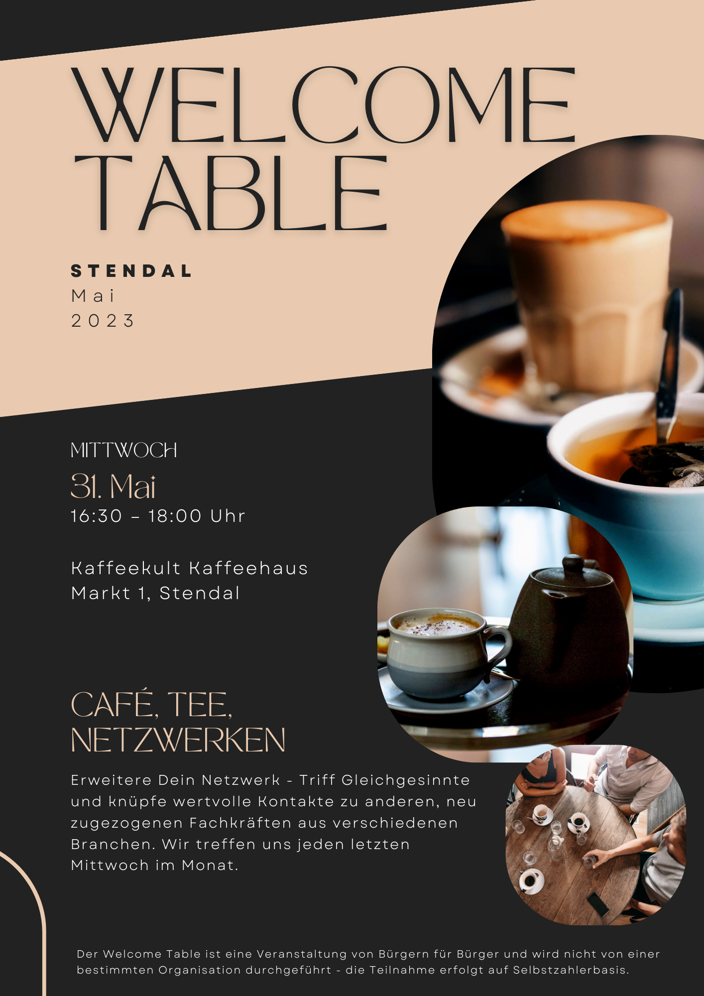 Dieser Welcome Table soll immer am letzten Mittwoch des Monats stattfinden und möglichst niederschwellig gehalten werden. Es gibt keine Agenda oder anderweitige Vorgaben – jeder ist willkommen und eingeladen, beim gemeinsamen Kaffee mit den anderen Teilnehmern ins Gespräch zu.