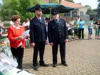 Die Grüße und Glückwünsche der Einheitsgemeinde Stadt Bismark (Altmark) überbrachte die Bürgermeisterin Frau Schlüsselburg. Sie dankte allen Kameraden der Jubiläumswehr und den Gastwehren für die ständige Einsatzbereitschaft. Frau Schlüsselburg versprach spontan Hilfe bei der Aufarbeitung der vorhandenen Unterlagen zur Geschichte der Feuerwehr. Sie freute sich gemeinsam mit allen Poritzern über die gut vorbereiteten Feuerwehrjubiläumsfeierlichkeiten, die sicher auf besondere Weise in die Chronik eingehen. Danach überbrachten die Gäste ihre Glückwünsche und Geschenke, wie hier auf dem Foto Eduard Schmidt und Reinhard Lenz von der Nachbar-Ortswehr Döllnitz