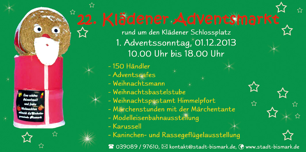 22. Klädener Adventsmarkt rund um den Schlossplatz am 1. Advent (01.12.2013) ab 10.00 Uhr