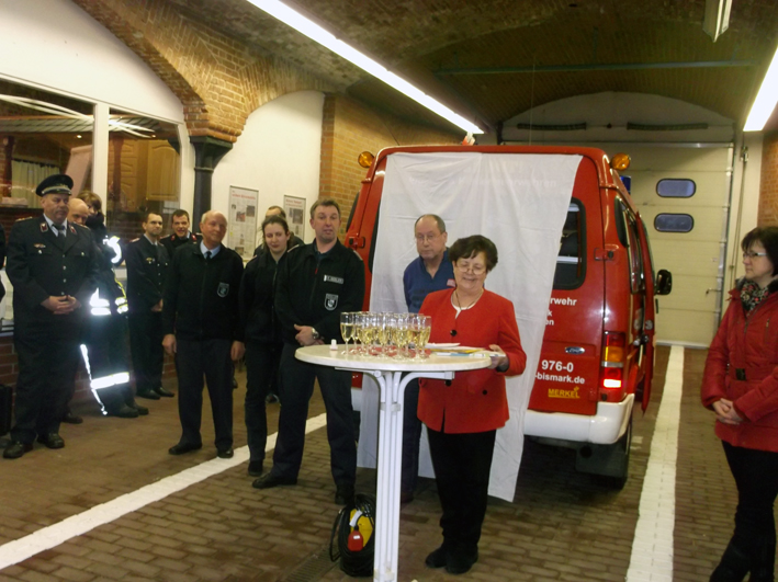 Den Fahrzeugschlüssel überreichte die Bürgermeisterin an den Klädener Ortswehrleiter Frank Seeler, weil das Fahrzeug am Standort Kläden stationiert wird. Gemeinsam mit der Einheitsgemeinde-Jugendwartin Nancy Mangelsdorf und Stadtwehrleiter Hans-Hermann Haak enthüllte die Bürgermeisterin die Heckaufschrift des neuen Fahrzeuges mit dem Kennzeichen SDL-JF 100.