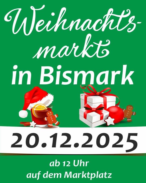 Die Stadt Bismark lädt herzlich zum diesjährigen Weihnachtsmarkt ein! Freuen Sie sich auf einen festlichen Tag mit einem abwechslungsreichen Programm für Groß und Klein, stimmungsvoller Musik und weihnachtlichen Überraschungen.