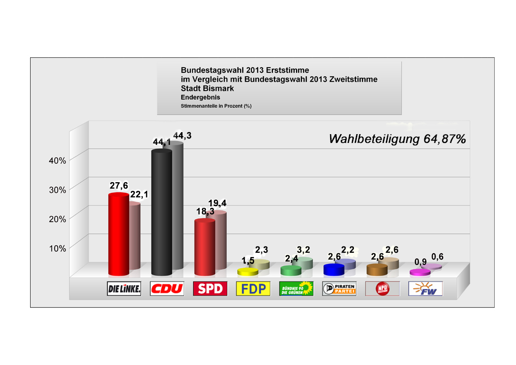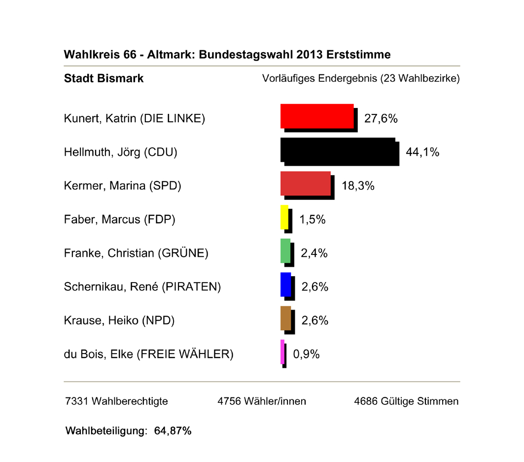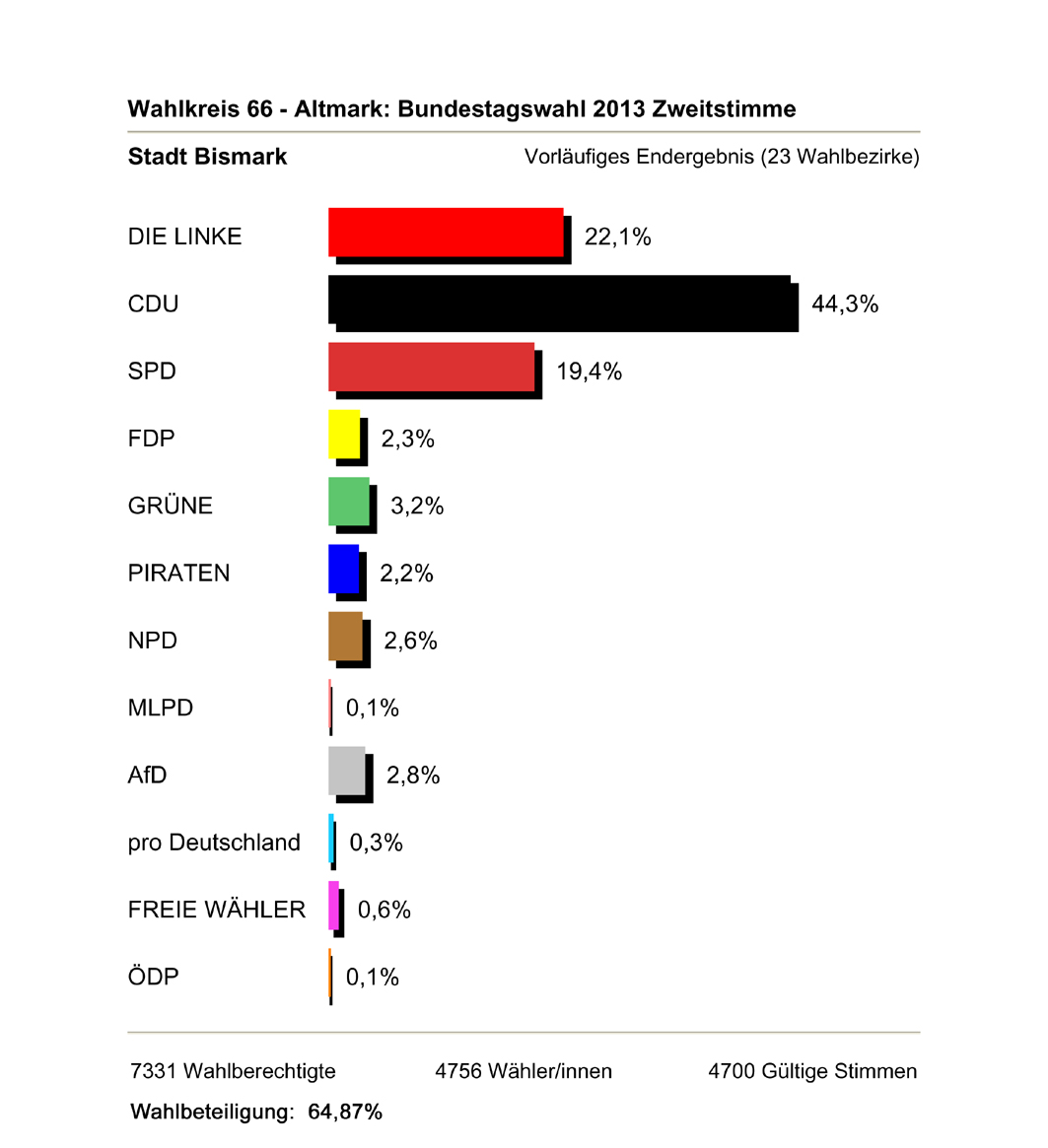 Zur Bundestagswahl am 22.09.2013 haben von 7.331 Wahlberechtigten in der Einheitsgemeinde Stadt Bismark (Altmark) 4.174 Wähler in den 22 Wahllokalen von ihrem Wahlrecht Gebrauch gemacht.