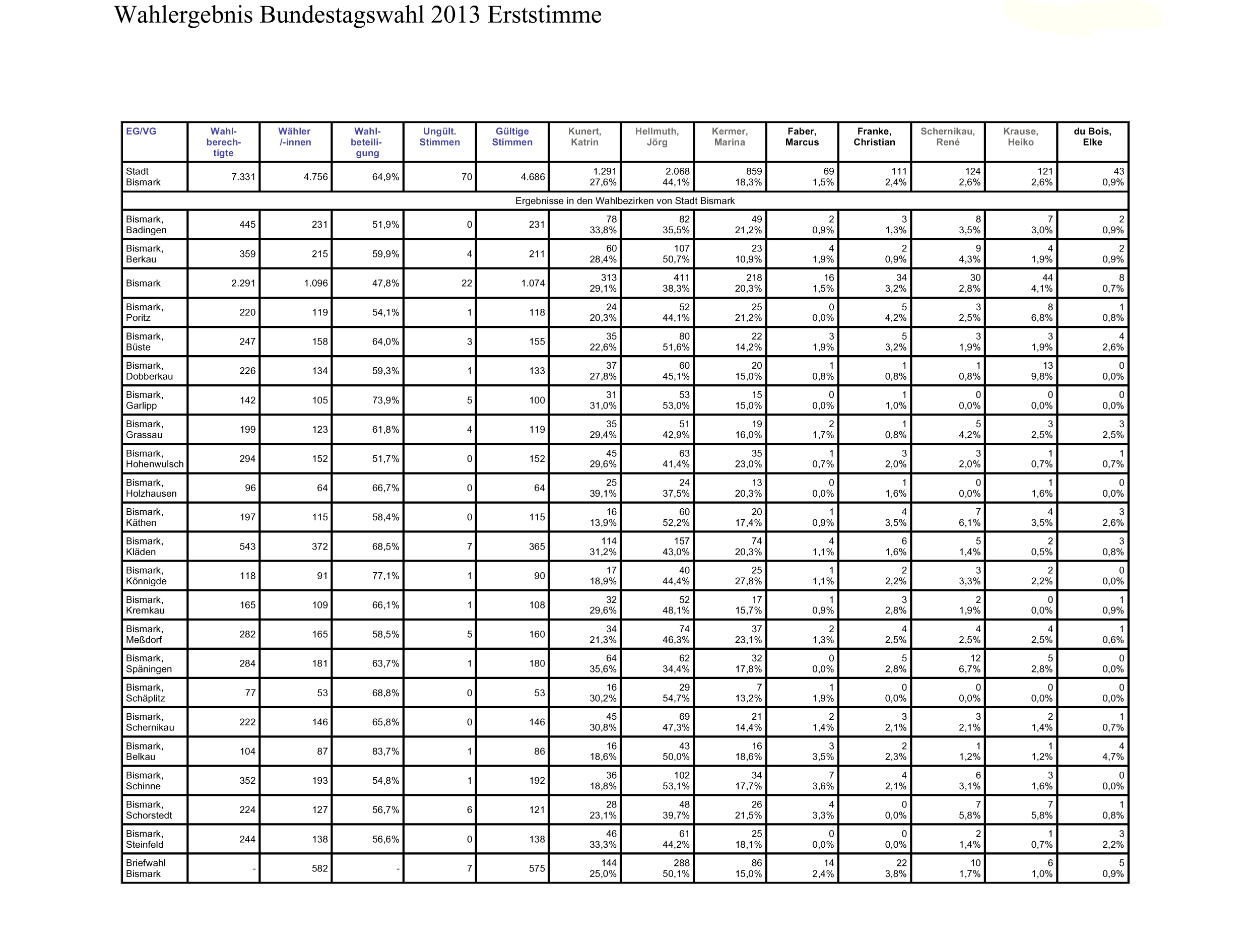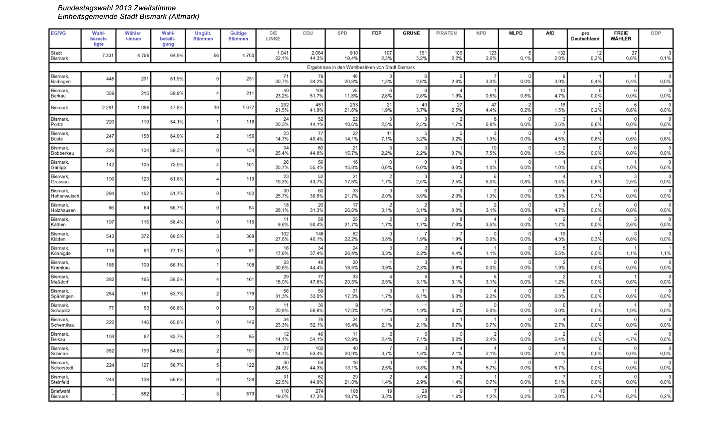 Bundestagswahl 2013 Wahlergebnisse der Einheitsgemeinde Stadt Bismark (Altmark)
