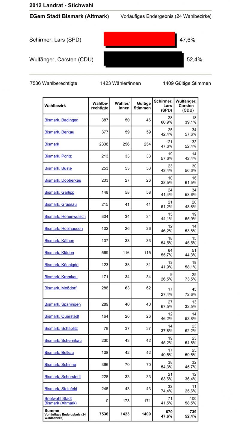Carsten Wulfänger konnte sich in der Stichwahl am 09.12.2012 gegen Lars Schirmer (SPD) durchsetzen. Wie die einzelnen Orstschaften der Einheitsgemeinde Stadt Bismark (Altmark) gewählt haben erfahren Sie in der nachfolgenden Tabelle.