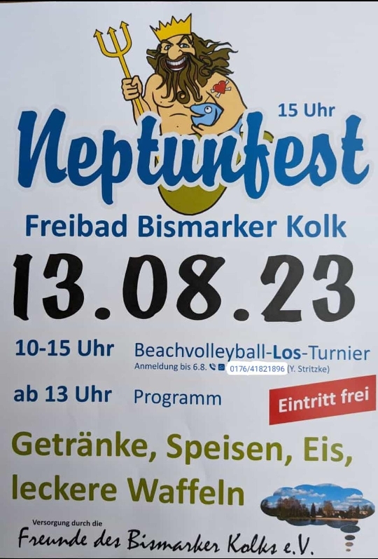 in Zusammenarbeit mit dem Heimatverein Bismark laden wir Sie herzlich zum Neptunfest am Sonntag den 13.08.23 in unser schönes Freibad Kolk ein.