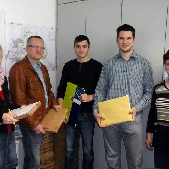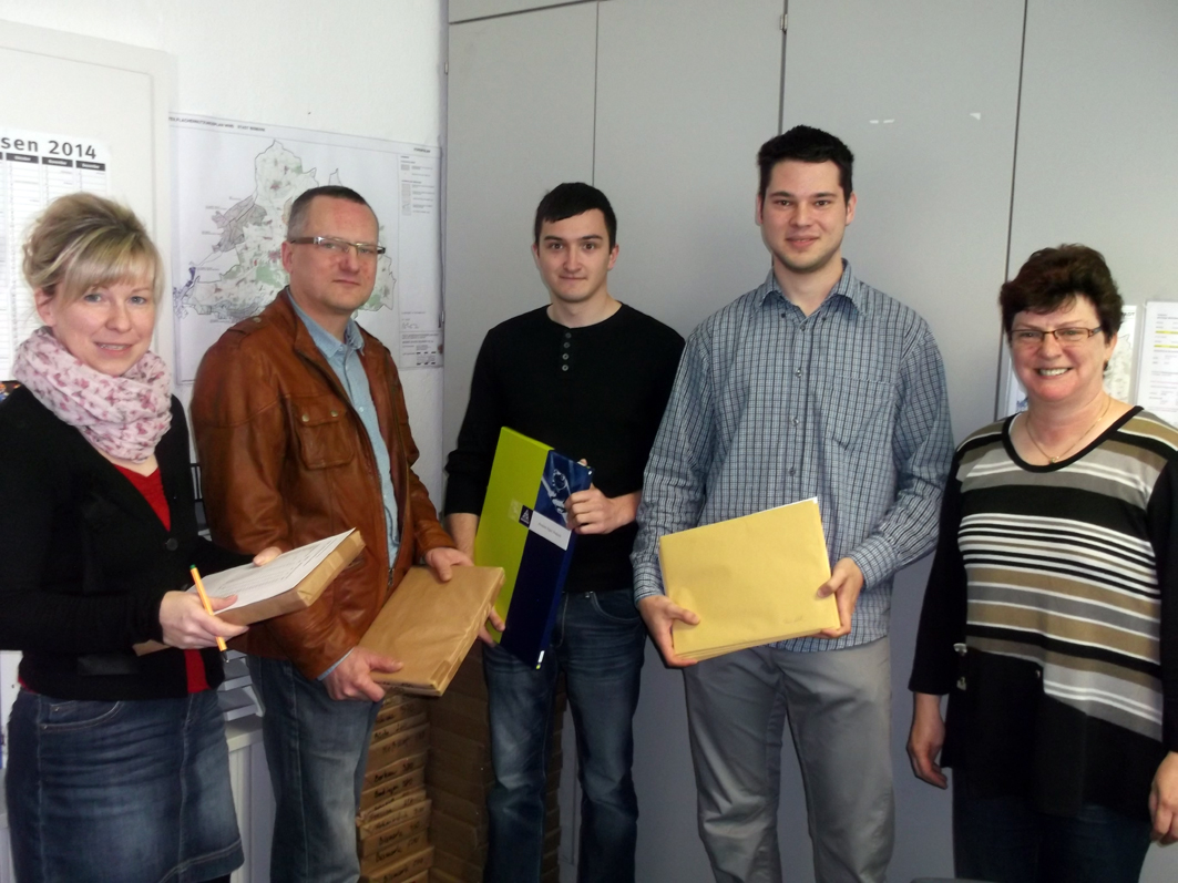 v.l.n.r. Hier das Wahlteam um Wahlleiterin Judith Budach bei der Entgegennahme der Stimmzettel von der Druckmanufaktur Hartmut Holz. Auf dem Bild weiterhin zu sehen sind die Auszubildenden Tim Schmidt und Tilo Ladewig, die in die Arbeit des Wahlteams einbezogen wurden und