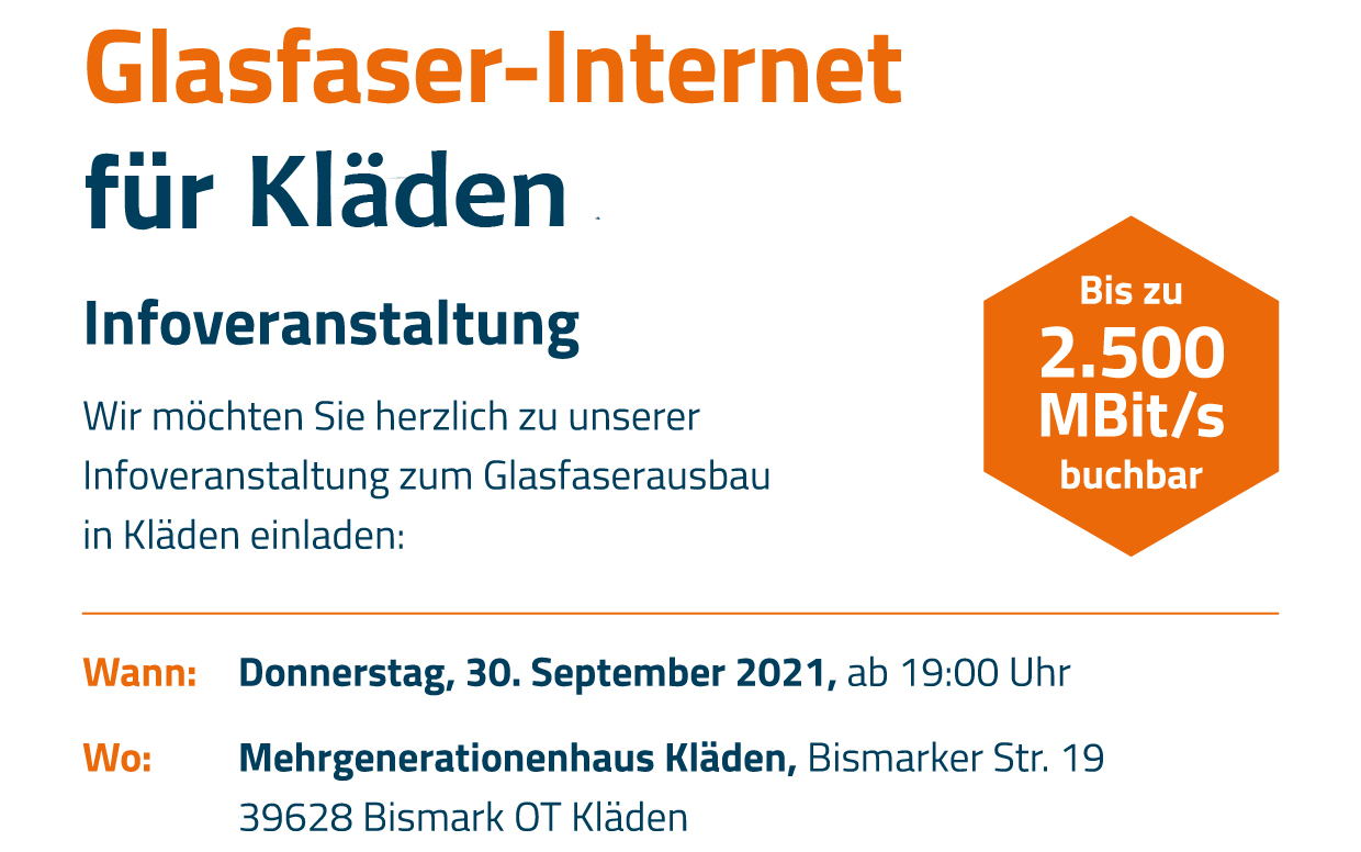Einladung - Informationsveranstaltung Glasfaser für Kläden 30.09.2021