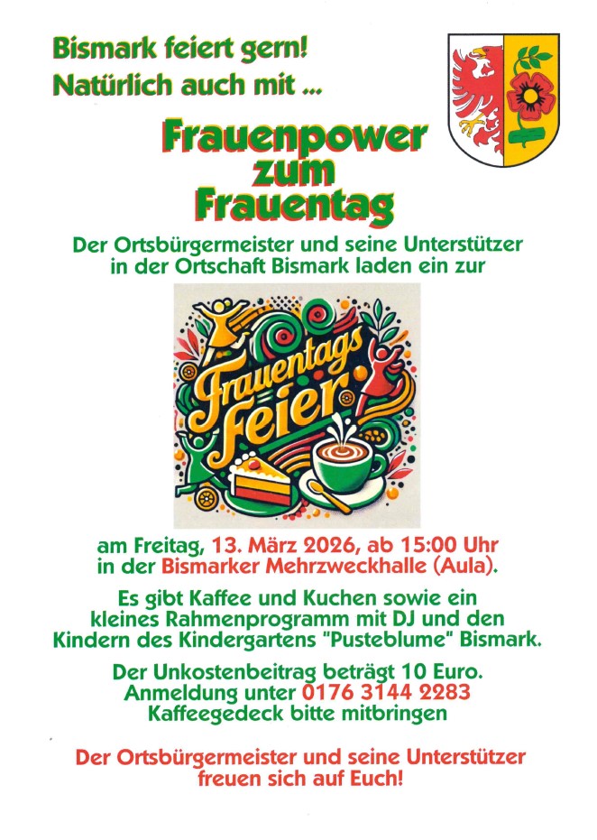 Der Ortsbürgermeister Frank Piotrowski und seine Unterstützer in der Ortschaft Bismark laden zur Frauentagsfeier am 13. März 2026 in die Aula der Mehrzweckhalle ein.