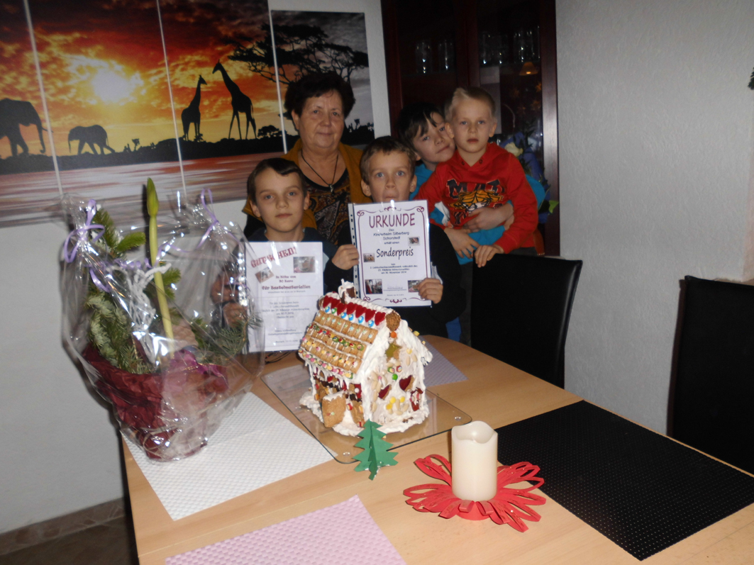 Weihnachtsmarktes und des Klädener Adventsmarktes. Und damit war man dann schon beim Thema. Die Kinder haben nämlich den Sonderpreis beim Lebkuchenwettbewerb der Einheitsgemeinde gewonnen. Die Urkunde und einen tollen Gutschein brachte die Bürgermeisterin mit und die Kinder erklärten ihr stolz, wer das Marzipanherz und wer den Zuckerguss am Lebkuchenhaus anbrachte. Im Augenblick steht das Häuschen noch, bis auf kleinere Knabbereien, die schon gut geschmeckt haben.