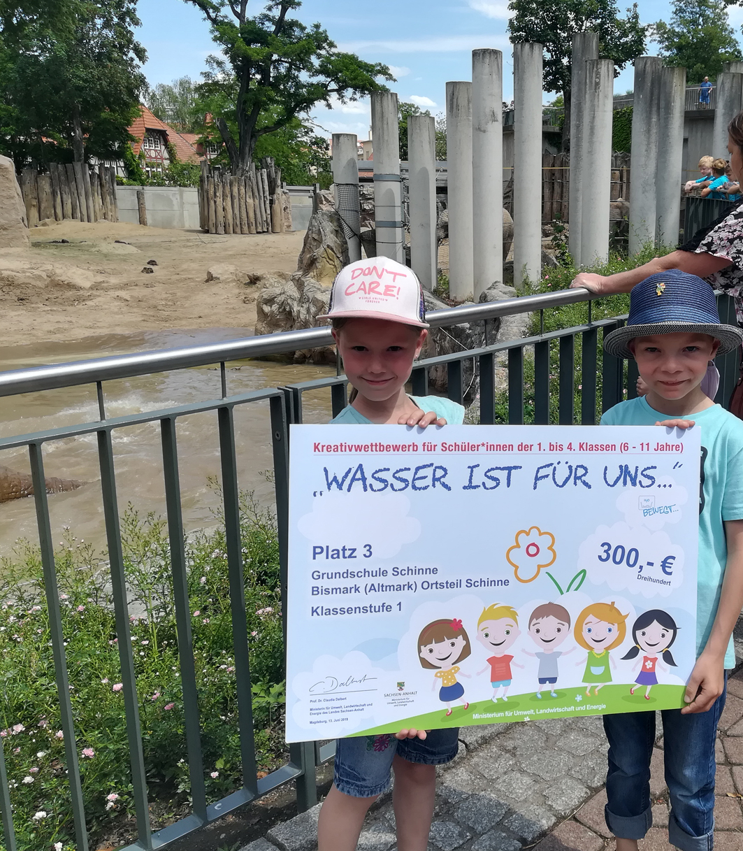 Die Kinder der ersten Klasse der Grundschule Schinne beteiligten sich mit einem Bildband selbstgemalter Bilder rund um das Thema Wasser und wurden zur Preisverleihung am 13.06.2019 in den BergZoo nach Halle eingeladen. Stellvertretend für alle Schüler ihrer Klasse sind Hanna Henschel und Lennard Zorn der Einladung gefolgt.