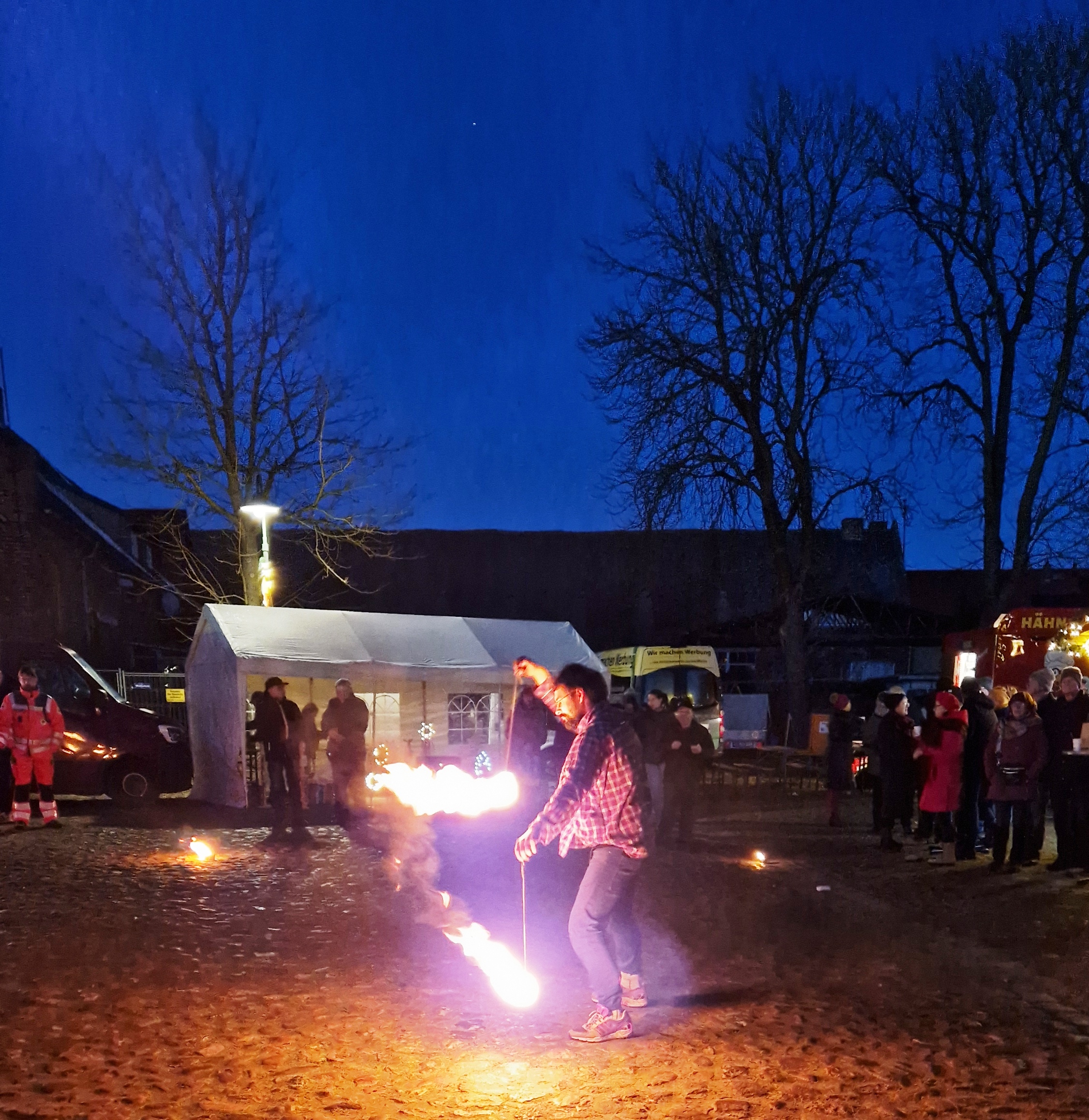 Mit einem bunten Kulturprogramm auf der Bühne, vielen netten Begegnungen und vorweihnachtlichen Akzenten hatte der Markt zum Auftakt in die Weihnachtszeit wieder für Jedermann etwas zu bieten. Nach der Eröffnung durch Bürgermeisterin Annegret Schwarz stimmten zunächst der Gladigauer Posaunenchor und anschließend "The Wannabe Teacher" mit Weihnachtsliedern auf die besinnliche Zeit ein. Mit tollen Tanzeinlagen verzückten dann die Kindertanzgruppen der Bismarker Diamonds das Publikum, ehe die Packebuscher Blasmusikanten an der Reihe waren. In der Dämmerung eines herrlichen Wintertages setzte Lasse Krebber mit einer kleinen Feuershow dann den Schlusspunkt auf der Hauptbühne.