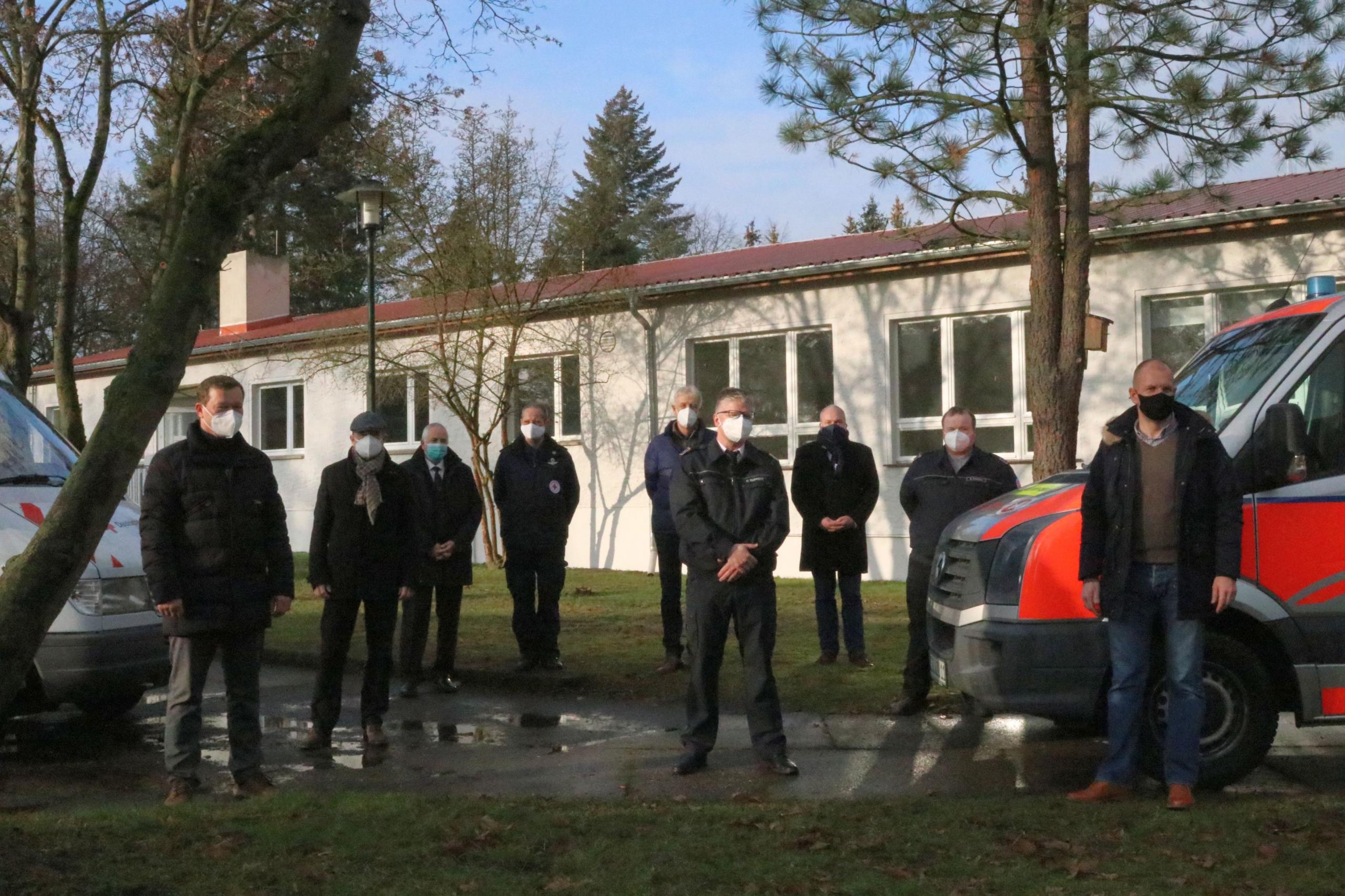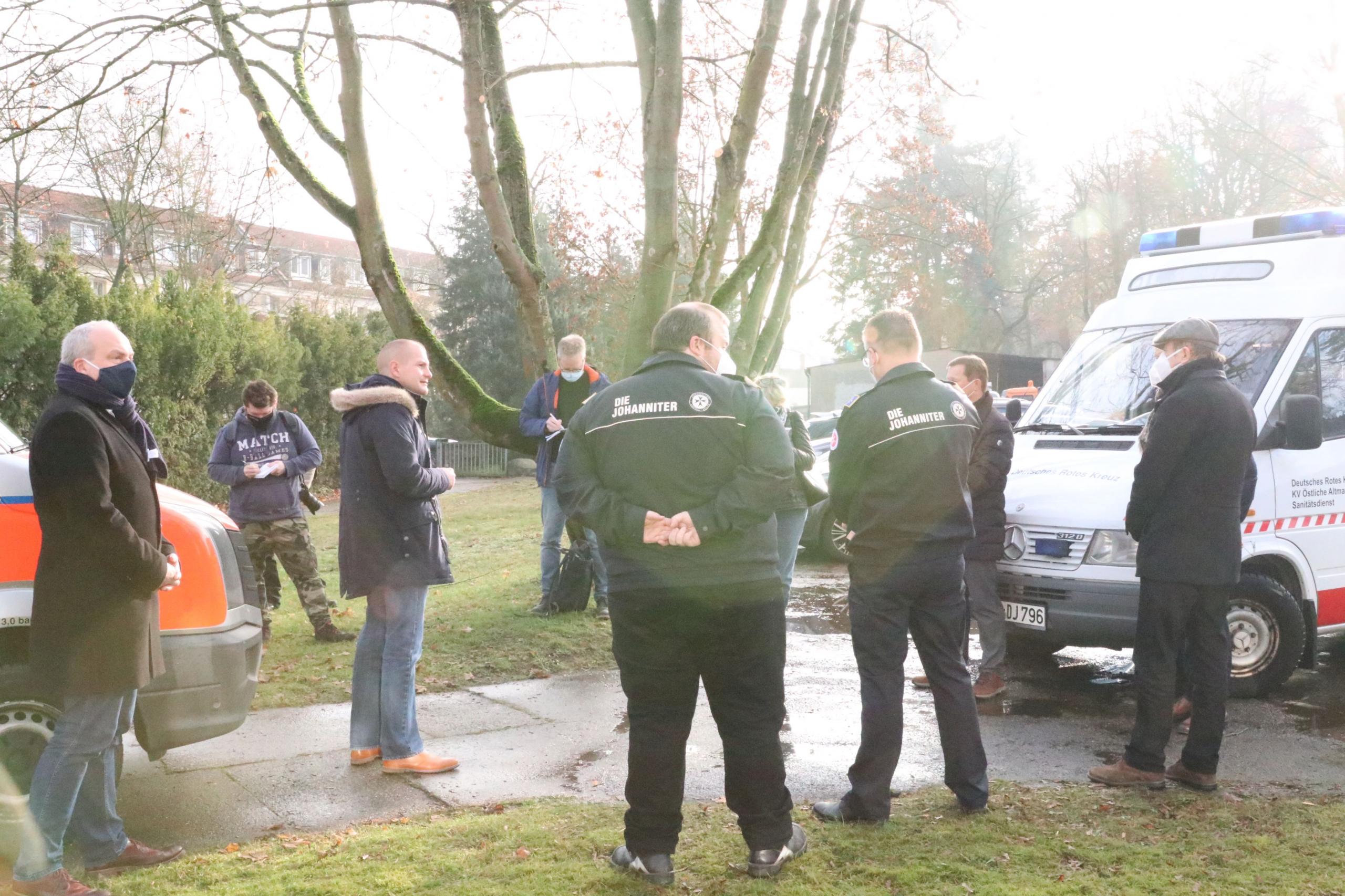 Erster Beigeordneter Sebastian Stoll, Oberbürgermeister Klaus Schmotz und Dr. Jörg Böhme (KVSA) begutachteten heute am 16. Dezember die Räume des Impfzentrums in Stendal. Zusammen mit den Vorständen des Deutschen Roten Kreuz und der Johanniter Unfall Hilfe e.V. stehen Sie vor dem eingerichteten Flachbau und verkünden: "Wir sind vorbereitet!"
