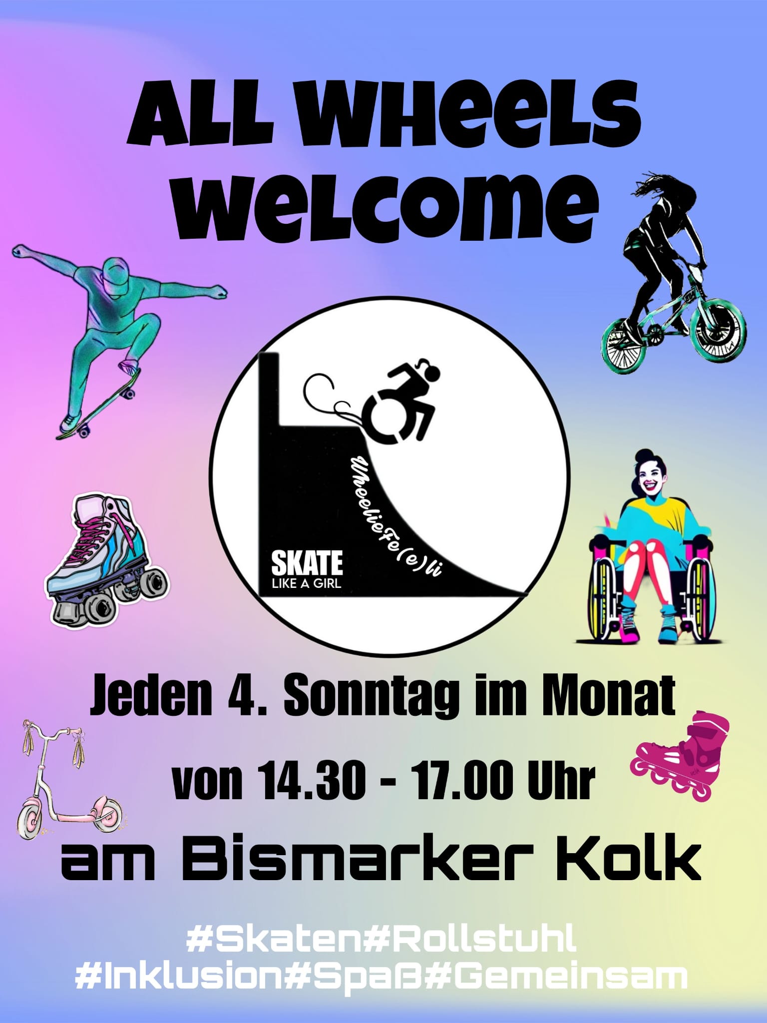 Ein tolles Angebot gibt es ab sofort an jedem 4. Sonntag im Monat von 14:30 - 17:00 Uhr, wenn auf der Skaterbahn am Bismarker Kolk ein "Inklusives Skatetreffen" stattfindet. Egal ob im Rollstuhl oder ohne - hier skaten alle gemeinsam und zeigen ihre Tricks und Skills.