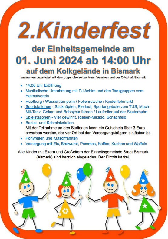 Am Kindertag, den 01. Juni um 14 Uhr wird die von der Einheitsgemeinde, dem Jugendfreizeitzentrum, den Vereinen und der Ortschaft organisierte Veranstaltung auf dem Kolkgelände eröffnet.