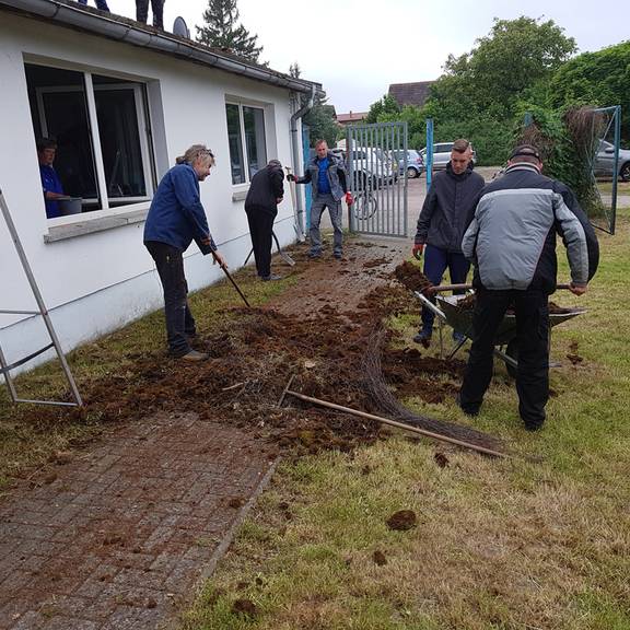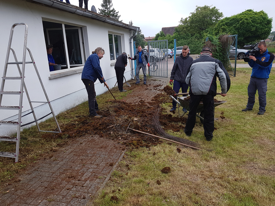 Mit einem lauten Sport frei, alle sind mit dabei machte der Reporter alle Helfer mobil. Gemeinsam stiegen Schwarz, Lenz und Waisan auf das Dach des Sportlerheims, um dieses vom Moos zu befreien. Andere Helfer putzten die Fenster, reinigten die Räume und jäteten Unkraut auf der Laufbahn des Sportplatz.