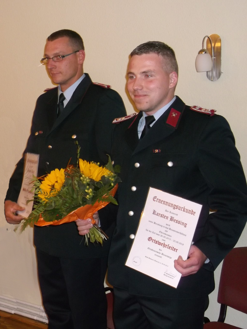 Der Kamerad Karsten Bessing wurde auf der Stadtratssitzung am 26.09.2012 in Deetz zum Ortswehrleiter für Beesewege berufen. Alle Unklarheiten, die die Berufung auf der Stadtratssitzung im Juni vertagen ließen, wurden mit dem Ortschaftsrat Hohenwulsch, dem Ordnungsamt und der Stadtwehrleitung geklärt. Kamerad Bessing wird nun die Geschicke der Ortsfeuerwehr in Beesewege bis September 2018 leiten. Ebenfalls berufen wurde der Kamerad Tobias Voigt. Er erhielt die Ernennungsurkunde als stellvertretender Ortswehrleiter Deetz ebenfalls bis September 2018.