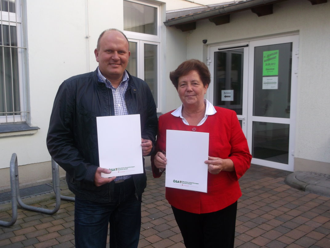 Guido Klautzsch, Geschäftsstellenleiter der ÖSA-Versicherungen überreichte im September an die Bürgermeisterin einen Scheck über 430 EUR für die Ortswehren Käthen und Bismark anlässlich ihres 100. und 130. Jubiläums. So gingen an die Ortswehr Käthen 250 Euro und an die Ortswehr Bismark 180 Euro finanzielle Unterstützung von den ÖSA-Versicherungen.
