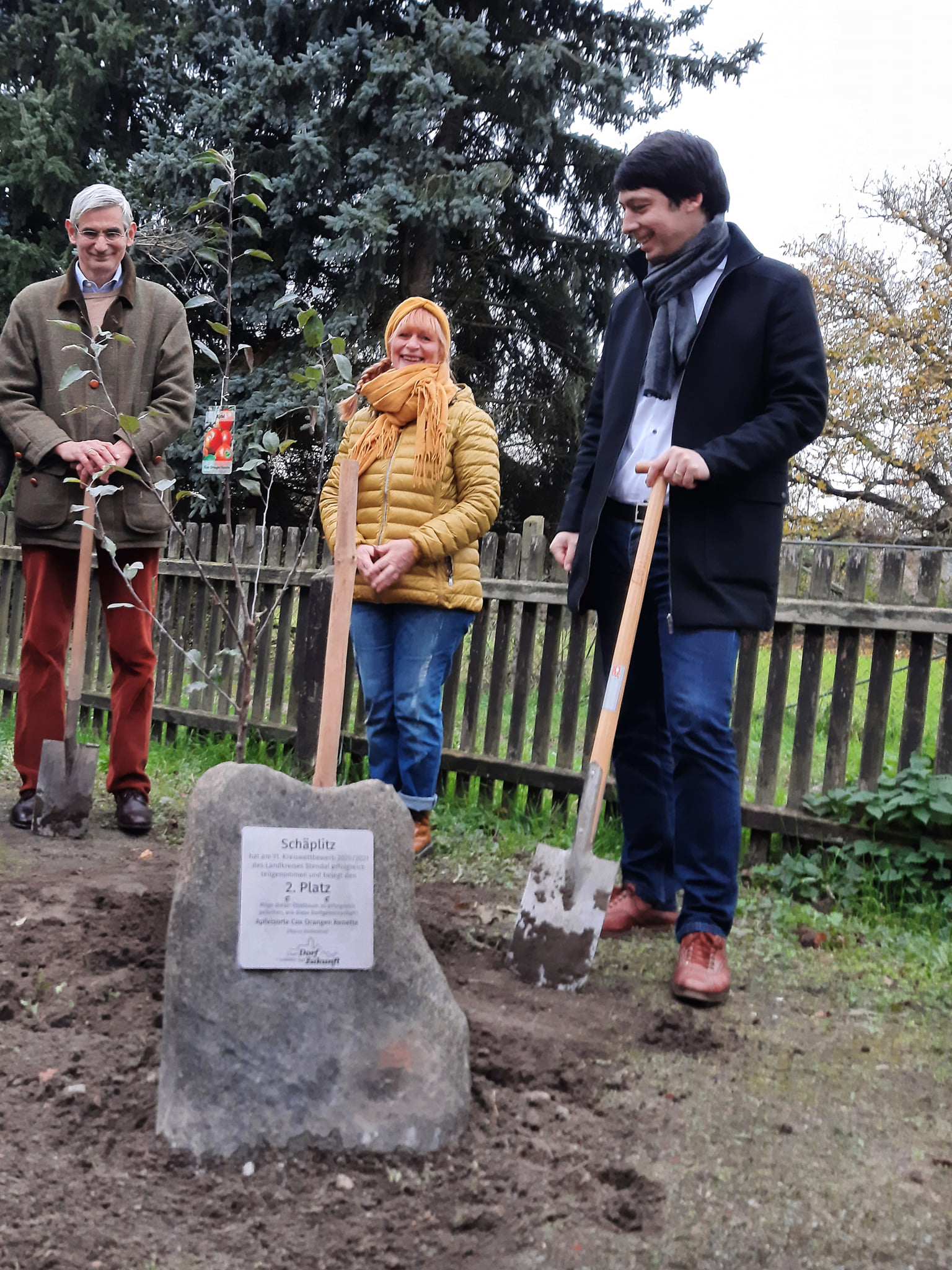 Im Rahmen des Steinfelder Bauernmarktes wurden Ende September die Sieger des Wettbewerbs "Unser Dorf hat Zukunft" verkündet. Die Ortschaft Schäplitz wurde mit einem hervorragenden 2. Platz bedacht und erhielt darüber hinaus auch ein Preisgeld in Höhe von knapp 2.000€. Obendrauf überreichte Landrat Patrick Puhlmann einen Apfelbaum mit der Aufschrift "Möge dieser Obstbaum so erfolgreich gedeihen wie diese Dorfgemeinschaft!", welchen er Anfang November im Rahmen eines Herbstfestes mit Ortsbürgermeister Bernhard Langels (links) und Einheitsgemeindebürgermeisterin Annegret Schwarz auf dem Altmarkhof einpflanzte.