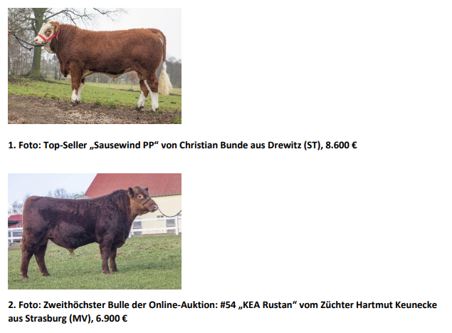 Dank der Online-Auktion konnten auch Gebote außerhalb des RinderAllianz-Gebietes (Mecklenburg-Vorpommern und Sachsen-Anhalt) realisiert werden. Bieter aus dem gesamten Bundesgebiet waren dabei. Zukünftig werden 6 der Auktionsbullen auf verschiedenen Besamungsstationen im Einsatz