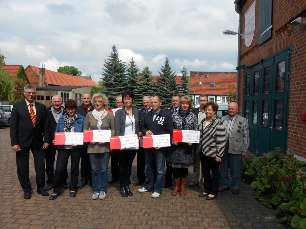 Am Mittwoch letzter Woche war Klaus Schmekies, Kommunalreferent bei der E.ON AVACON zur Scheckübergabe an 8 Vereine und Institutionen der Einheitsgemeinde Stadt Bismark (Altmark) in Poritz zu Gast, die in Abstimmung mit der Bürgermeisterin ausgezeichnet wurden. Bei insgesamt 230 Ortschaften, die vom Kommunalreferenten der E.ON AVACON betreut werden, fiel es schwer, eine Auswahl zu treffen. Wir engagieren uns in der Kinder- und Jugendförderung, betonte Klaus Schmekies - so gehörten dann auch die Kita Regenbogenland in Berkau (300 ) und die Kita Pittiplatsch in Kläden (300 ) zu den Begünstigten, denn beide Einrichtungen begehen in diesem Jahr ihr 60-jähriges Bestehen. Weitere Schecks wurden an die Ortschaften Garlipp (825-Jahr-Feier, 100 ), Schinne (825-Jahr-Feier, 100 ), Grassau (775-Jahr-Feier, 100 ) sowie an den Steinfelder Kulturverein anlässlich seines 20-jährigen Bestehens (200 ) übergeben. Preisträger weiterhin sind die Feuerwehr Poritz anlässlich 120-Jahr-Feier (200 ), die Feuerwehr Bismark anlässlich 130-Jahr-Feier (200 ) und abschließend die Feuerwehr Käthen für 100 Jahre Feuerwehr (300 ).