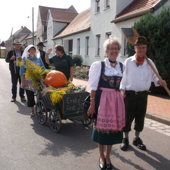 Nach dem bunt geschmückten Ernteumzug, angeführt von den Stendaler Stadtmusikanten, nahm Ortsbürgermeister Ralf Berlin in seiner Begrüßungsrede auch Gelegenheit, allen Organisatoren und fleißigen Helfern und den Sponsoren herzlich zu danken und freute sich, dass dieser Tag wieder ein kultureller Höhepunkt in Schinne ist, im Sinne der Gemeinsamkeit und Freude. Schließlich feierte Schinne in diesem Jahr nach der 825 Jahr-Feier bereits zum zweiten Mal in großer Runde.