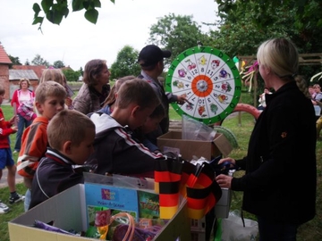 Eingeladen waren auch Familien und Bürger aus Grassau, Bülitz und Grünenwulsch, die sich zahlreich zuerst zu Kaffee und Kuchen und später zum Grillabend einfanden. Tolle Spiel- und Spaßstationen, wie Wetthüpfen, Ring- und Dosenwerfen waren für die Kinder aufgebaut und wurden immer wieder mit viel Freude in Anspruch genommen. Vor allem am Glücksrad riss die Schlange nie ab, denn hier gab es tolle Preise zu gewinnen. Und so stellte sich, wer sein Glück mit Drehen probiert hatte, meist gleich wieder hinten an, um es erneut zu versuchen . Auch Clown Tommy begeisterte mit seiner guten Laune und dem Modellieren von Luftballons. Selbst Teddybären und Papageien ließ er mit viel Geschick und unter den staunenden Gesichtern der Kleinen und Großen entstehen. Mitgebracht hatte der Clown auch seine Hüpfburg, die immer voll besetzt war mit fröhlichen Kindern. Die Gäste aus Weißrussland bedankten sich bei Renate Oesemann, ihren Mitstreitern und den Bürgern der Ortschaften mit einem kleinen weißrussischen Programm. Dafür ernteten sie viel Beifall und trugen so dazu bei, dass es ein kulturell bunt gemischtes erlebnisreiches Kinderfest für alle war.