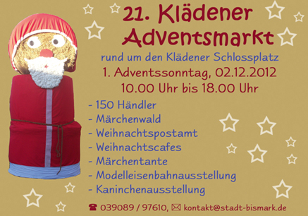 es ist wieder so weit, der Klädener Adventsmarkt steht vor der Tür und wir bitten Sie (wieder) um Ihre Unterstützung. In all den zurückliegenden Jahren war es nur mit Hilfe von vielen Sponsoren, Spendern und freiwilligen Helfern möglich, diesen schönen Adventsmarkt, mit seiner großen Ausstrahlung, auch über unsere Region hinaus, zu veranstalten.