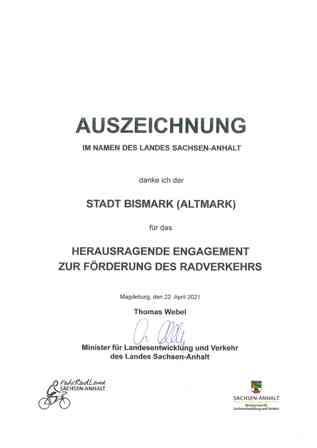 "Als besondere Anerkennung überreiche ich der Stadt Bismark (Altmark) beiliegende Auszeichnung für herausragendes Engagement zur Förderung des Radverkehrs.