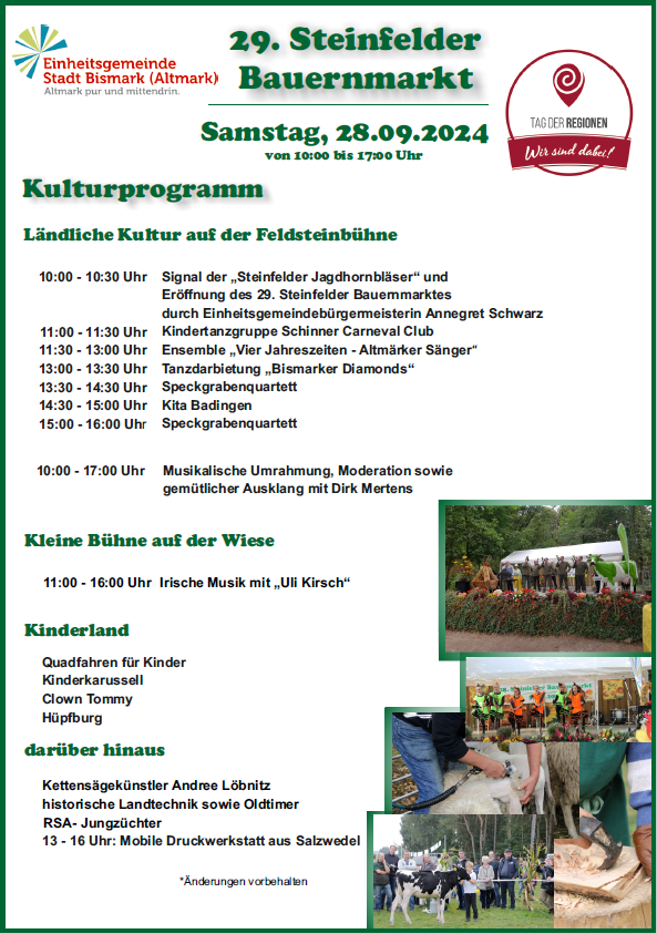 Bürgermeisterin Annegret Schwarz eröffnet gemeinsam mit den Stadträten und Ortsbürgermeistern sowie ihren Gästen traditionell auf der Feldsteinbühne um 10:00 Uhr den Steinfelder Bauernmarkt. Selbstverständlich sind die Steinfelder Jagdhornbläser ebenfalls dabei und geben Signal.