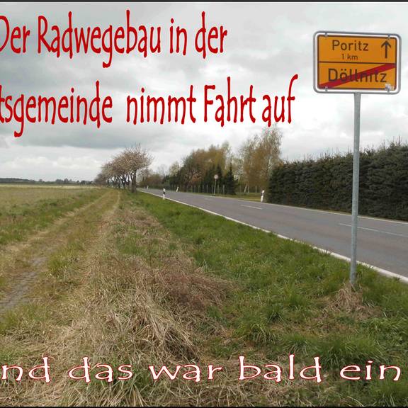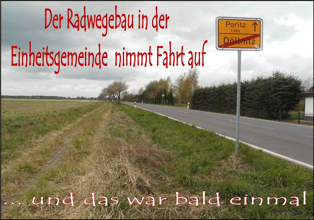 Gegenwärtig laufen die Bauarbeiten zur Erneuerung des straßenbegleitenden Radweges entlang der Landesstraße L 21 zwischen Döllnitz und Poritz. Die Landesstraßenbaubehörde Regionalbereich Nord als Straßenbaulastträger hat die Bauleistungen im I. Quartal 2015 ausgeschrieben und den Auftrag an eine regional ansässige Firma erteilt. Unmittelbar nach Ostern wurde der Baustart mit der Beantragung der erforderlichen Genehmigungen zur Verkehrsraumeinschränkung vollzogen. Nach der erforderlichen Beschilderung der Baustelle und vorbereitenden Baugrundarbeiten wird gegenwärtig das alte Betonsteinpflaster aufgenommen und der Unterbau für den neuen Radweg auf einer Länge von 1,3 km aus Asphalt hergestellt. Die Ortsdurchfahrt Döllnitz wird derzeit nicht berührt. Der Radweg wird in einer Breite von 2,00 m ausgebaut. Die Fertigstellung soll bis spätestens 30.06.2015 erfolgen und wird so, wie das Teilstück Bismark Döllnitz, hergestellt.