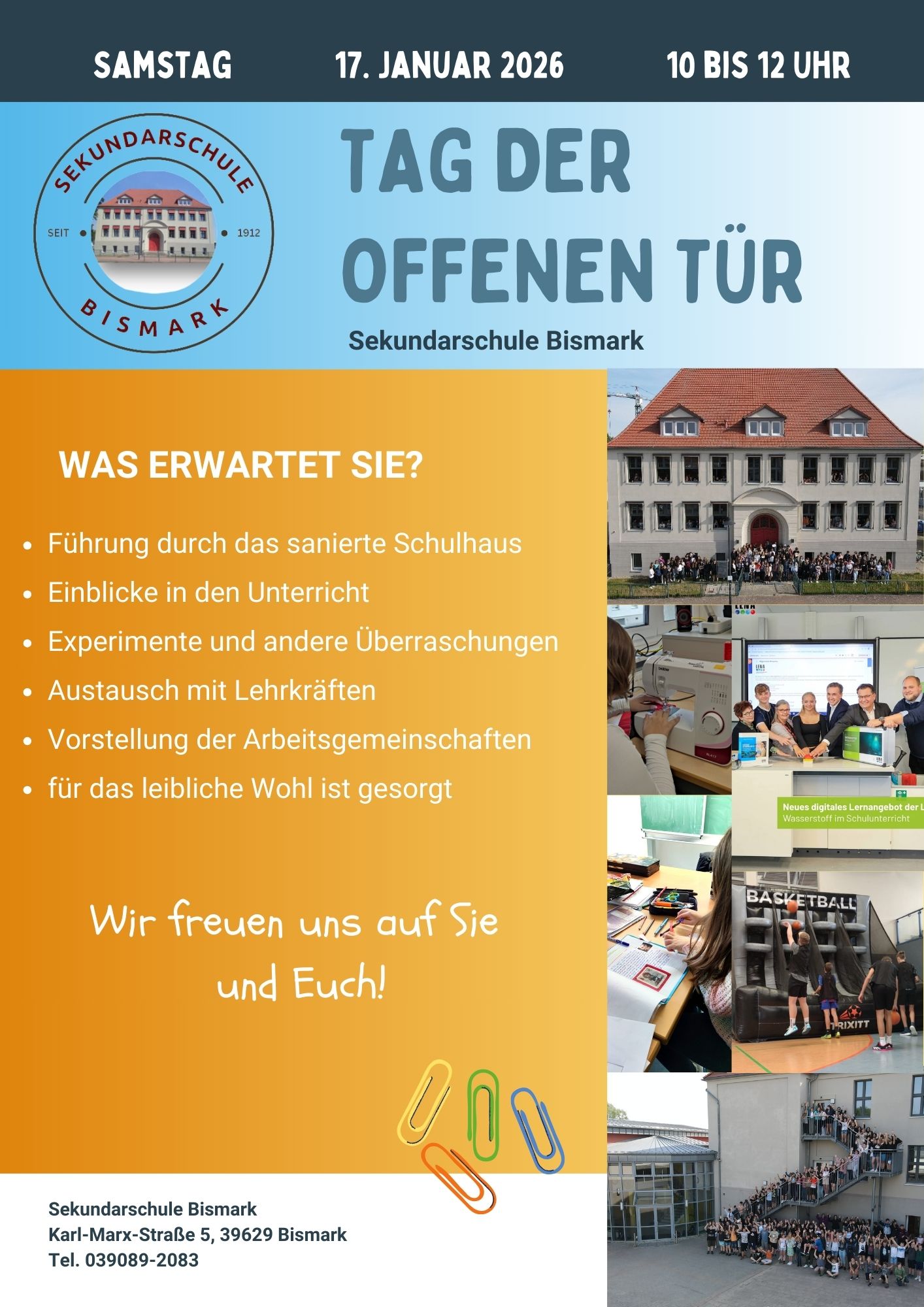 Am 27.01.2026 soll im Zeitraum von 10 bis 12 Uhr wieder ein "Tag der offenen Tür" in der Sekundarschule Bismark (Karl-Marx-Straße 5, 39629 Bismark) stattfinden.