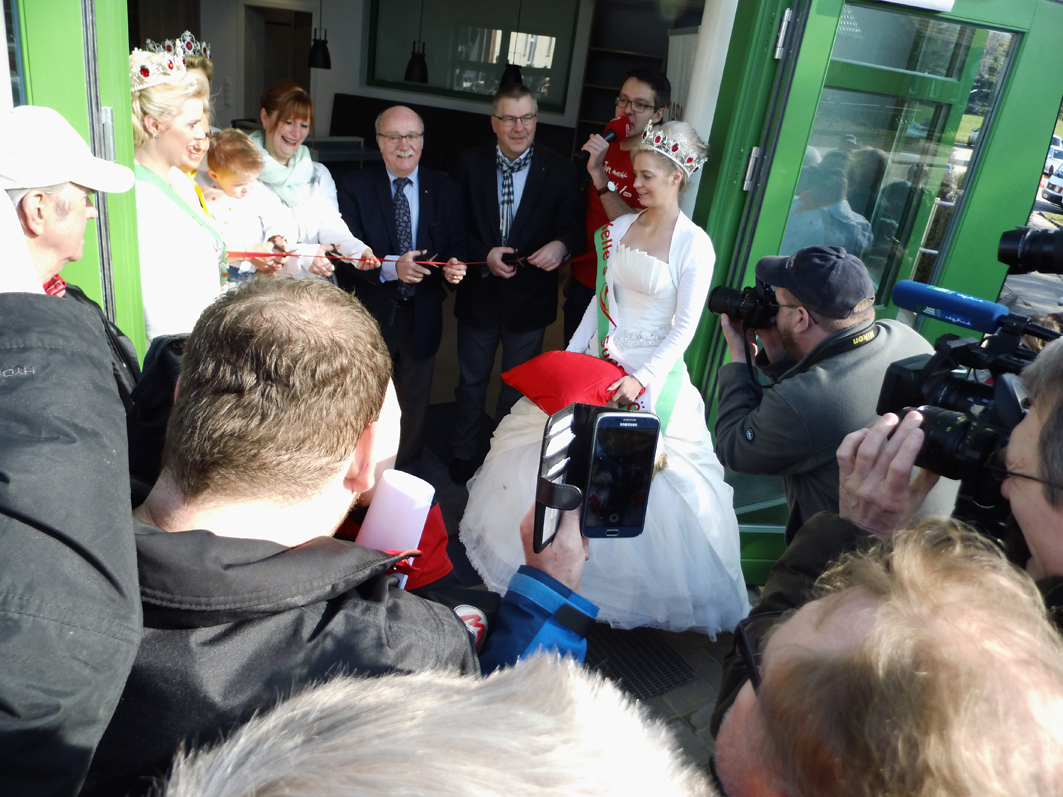 Die offizielle Übergabe und den Scherenschnitt vollzogen Inhaberin Antje Mandelkow, Rainer Thiele, Senior-Chef der Kathi GmbH aus Halle, Einheitsgemeindebürgermeisterin Annegret Schwarz und Planer Jens Burckhardt.