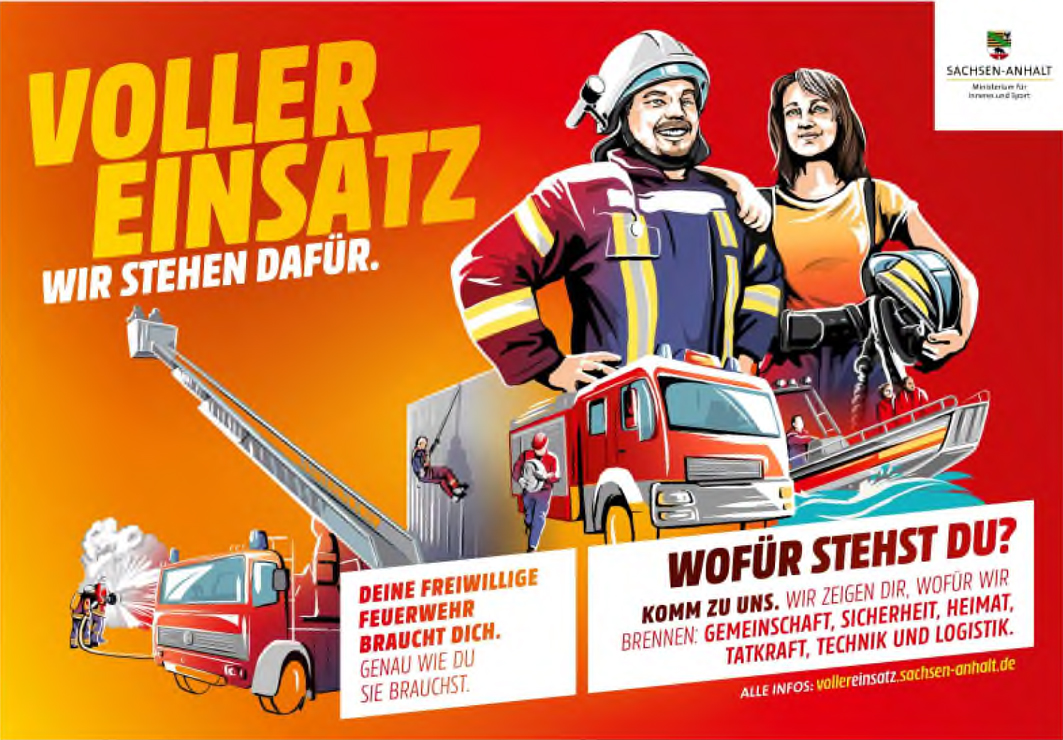 Am 19.04.2018 hat Innenminister Holger Stahlknecht die Kampagne zur Nachwuchs- und Mitgliedergewinnung für die Freiwilligen Feuerwehren im Land Sachsen-Anhalt gestartet. Das Maßnahmenpaket für die Gewinnung neuer Einsatzkräfte für die Freiwilligen Feuerwehren steht unter dem Motto Voller Einsatz.