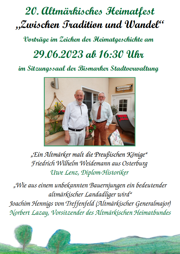 Der Donnerstag des 29. Juni steht ganz im Zeichen der Heimatgeschichte, wenn ab 16:30 Uhr Diplom-Historiker Uwe Lenz und der Vorsitzende des Altmärkischen Heimatbundes, Norbert Lazay, zu interessanten Vorträgen in den Sitzungssaal der Bismarker Stadtverwaltung einladen. Im Fokus stehen dabei mit Friedrich Wilhelm Weidemann (Hofmaler des preußischen Königs Friedrich Wilhelm I.) und Joachim Hennigs von Treffenfeld (Altmärkischer Reitergeneral) zwei geschichtsträchtige Personen mit altmärkischen Wurzeln.