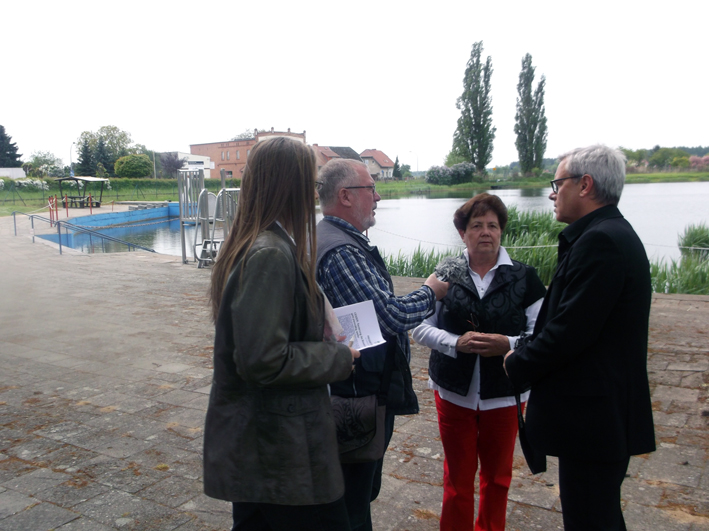 Zum Saisonbeginn machten sich Bürgermeisterin und LAG-Vorsitzende Verena Schlüsselburg gemeinsam mit Heike Winkelmann und Dr. Wolfgang Bock vom LEADER-Management ein Bild vom Baufortschritt. Als Schwerpunkt wurde in diesem Jahr mit Hilfe von LEADER die Sanierung des Daches am Unkleidehaus einschließlich der Erneuerung der Elektrik durchgeführt ebenso die teilweise Neugestaltung des sehr in die Jahre gekommenen Spielplatzes durch Aufstellen einer neuen Schaukel, Wippe und anderen Geräten. Pünktlich zur Eröffnung der diesjährigen Badesaison investierte die Einheitsgemeinde zudem 20.000 Euro aus ihrem Haushalt für Sanierungsarbeiten im Sanitärbereich, d.h. sowohl die Damen- als auch die Herren-WC`s wurden von Grund auf erneuert und verloren somit den Charme der 70-er Jahre.