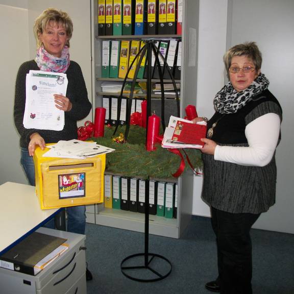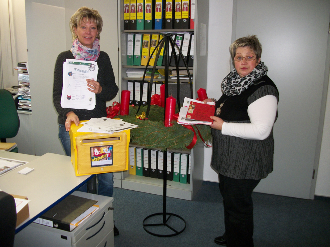 Camilla Motejat (links) und Kornelia Regber (rechts), Mitarbeiterinnen der Einheitsgemeinde, Stadt Bismark (Altmark) haben die auf dem Klädener Adventsmarkt im Weihnachtspostamt abgegebenen Wunschzettel an den Weihnachtsmann ausgezählt und am 07.12.12 an den Weihnachtsmann zur Weihnachtspostfiliale Himmelpfort weitergeleitet.