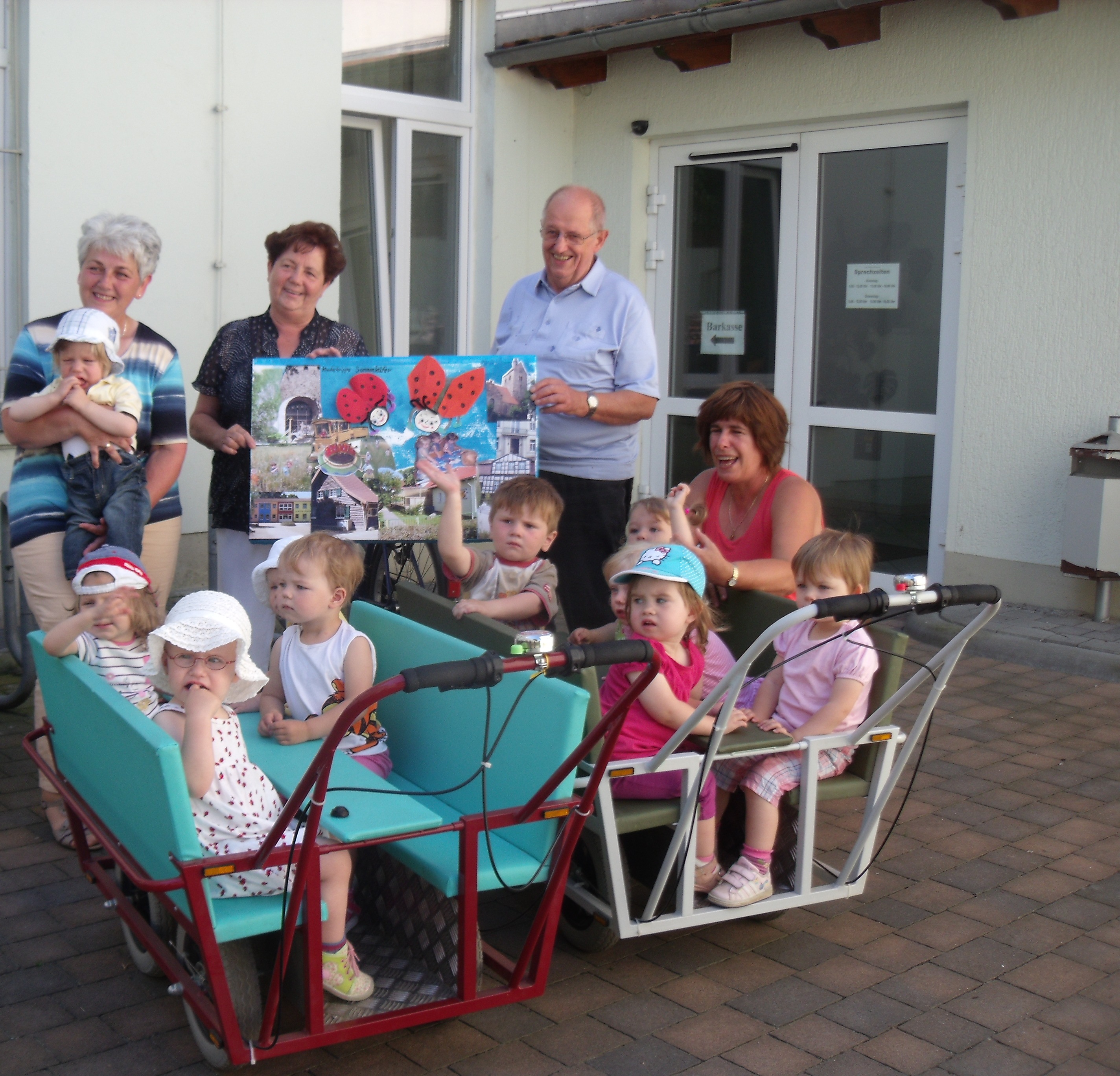 Und nun freuten sich die Bürgermeisterin und der Vereinsvorsitzende, dass die kleinen Sonnenkäfer aus der gleichnamigen Kinderkrippe der Ortschaft Bismark, gemeinsam mit ihrer Leiterin Waltraud Franke und der Erzieherin Andrea Engel,die ersten waren, die eine schöne Collage aus den Ergebnissen ihrer Beobachtungsgänge durch Bismark angefertigt hatten. Da ist z.B. die Goldene Laus, die Schule, das Kinder- und Jugendfreizeitzentrum, aber auch die schöne Holzeisenbahn, die auf dem Gelände der Kinderkippe zu täglichen Rundfahrten der Kleinen einlädt und viel Natur , denn auch die gehört zu unseren Orten. Nun bleibt noch Zeit bis zum 10. September für alle anderen, die sich am Zeichen- und Malwettbewerb der Einheitsgemeinde und des Vereins beteiligen wollen. Zum Saisonabschluss am Naturlehrweg werden alle kleinen Kunstwerke präsentiert und die Sieger mit kleinen Preisen geehrt.