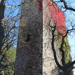 Sagen und Legenden ranken sich um den Turm der ehemaligen Wallfahrtskirche, die im Volksmund „Goldene Laus“ genannt wird, wohl aber unter dem Doppelpatrozinium „Maria-Himmelkönigin“ und zum „Hl. Kreuz“ stand. Von der ehemaligen Anlage steht nur noch das zwischen 1912-1916 restaurierte Westwerk, ursprünglich bestand das Bauwerk zudem aus Langhaus, Altarraum und Apsis. Die verschiedenen hohen Dachansätze des Langhauses an der Ostseite des Turmes lassen die einstige Größe der untergegangenen Kirche erahnen. Im vom Mystizismus behafteten Mittelalter ist die Kirche ein bedeutender Wallfahrtsort gewesen, zahlreiche Pilger suchten hier durch den Besuch eines angeblich wundertätigen und der Legende nach vom Himmel gefallenem Kreuz Vergebung und Heilung.