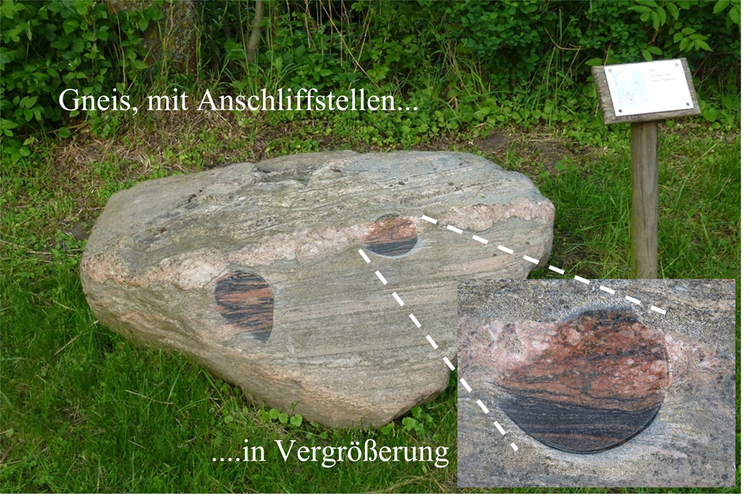 • Anschleiffflächen auf diversen Findlingen zur Verdeutlichung der eigentlichen Struktur oder des Gefüges