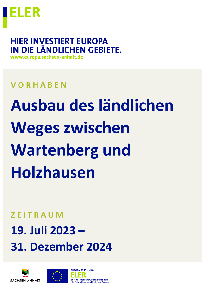 Der Ausbau des Ortsverbindungsweges zwischen Wartenberg und Holzhausen erfolgt in Betonspurbahnen auf einer Länge von 2270 m und einer Breite von 3,40 m (Spurbahnen 2 x 1,25 m und Mittelstreifen 0,90 m). Für die Ausgleichs- und Ersatzmaßnahmen werden entlang des Weges 40 Laubbäume und eine 200 m Strauch-Baum-Hecke gepflanzt, an 35 alten Obstbäumen ein Kronenerhaltungsschnitt durchgeführt sowie eine Stauanlage eines Nebengrabens des Secantgrabens saniert.