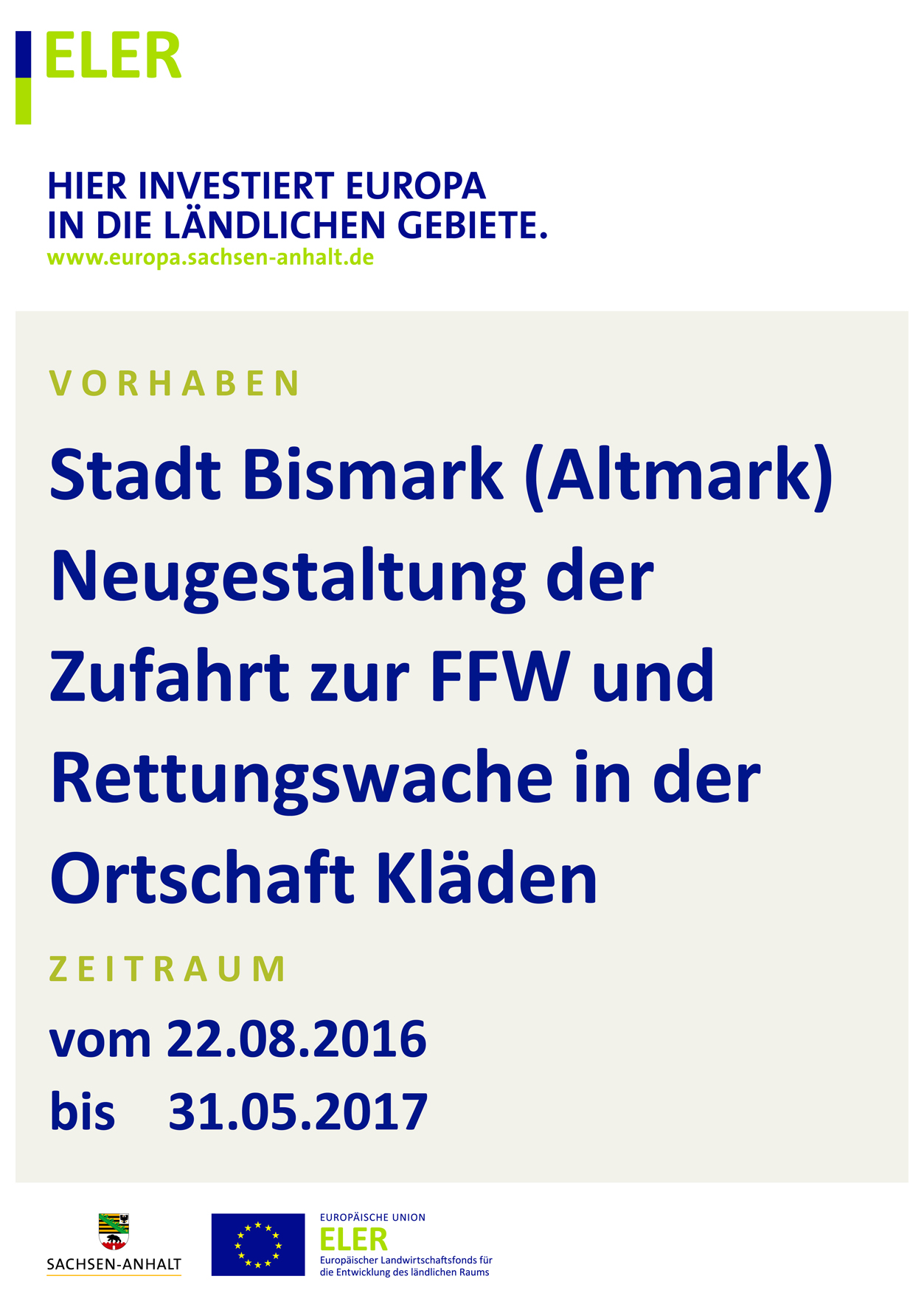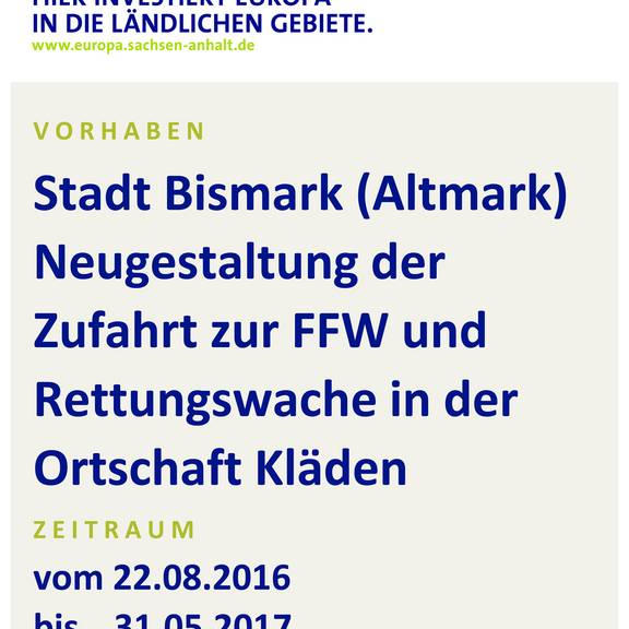 Das ALFF Altmark fördert in der jetzigen Antragsperiode 2016/2017 diese Maßnahme in der Stadt Bismark. Mit den Vorhaben wird die kommunale Infrastruktur verbessert. Die Zuwendungen wurden nach den Richtlinien zur Förderung der regionalen ländlichen Entwicklung in der Förderperiode 2014-2020 des Landes Sachsen-Anhalt (ELER) gewährt.
