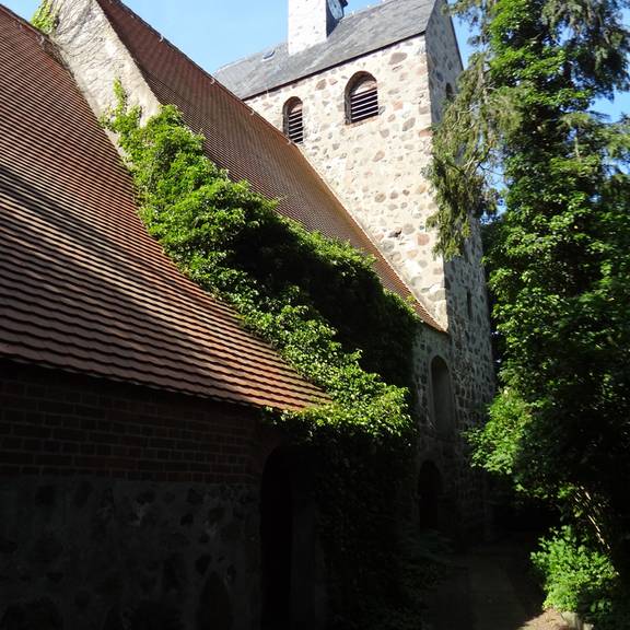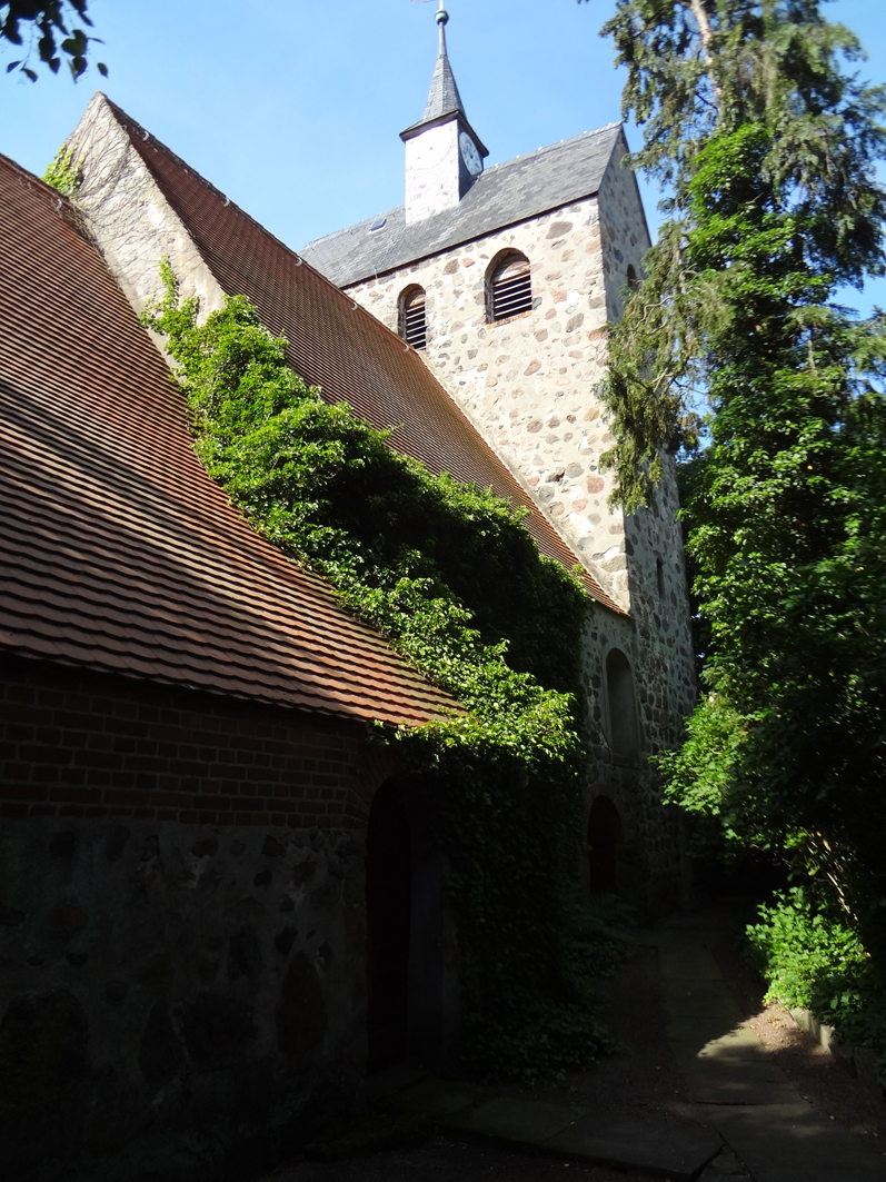 Der Poritzer Friedhof besticht durch seinen Baumbestand, so präsentiert sich die Dorfkirche, leicht versteckt, wie eingewoben im Grünen. Das Friedhofsportal ist in Backstein ausgeführt, der Rundbogen und die Gangpforte lassen auf die Entstehung im 16. Jh. schließen. Die dreiteilige Kirche, bestehend aus Westwerk, Langhaus und Chor, ist ein für die Entstehungszeit (13. Jh.) typisches Bauwerk, wobei viele Veränder-ungen und Ausbesser-ungen späterer Zeiten deutlich sichtbar sind. Der auffallend schmale Turm (10,10 x 4,5 m) ist mit einer hoch liegenden Quertonne geschlossen und besass ursprünglich einen romanischen Bogen als offenen Durchlass zum Langhaus. Die Zugänge zum Chor und Langhaus stammen aus der Entstehungszeit. Der Gemeindeeingang an der Nordseite des Langhauses und der Pfarrtür sind granitgefasst sowie die Chortür mit Sperrbalken. Der Chor selbst hat ein kuppelartiges Kreuzgratgewölbe, vergleichbar mit Döllnitz und Arensberg. Der Kanzelaltar, um 1710 entstanden, präsentiert sich im ländlichen Barock, bemerkens-wert ist der frei schwebende Schalldeckel. Die Innenräume des Langhauses und Chores sind durch die ausgedehnten Emporenanlagen geprägt, die einst auch eine Erweiterung des Chorbogens notwendig machte.